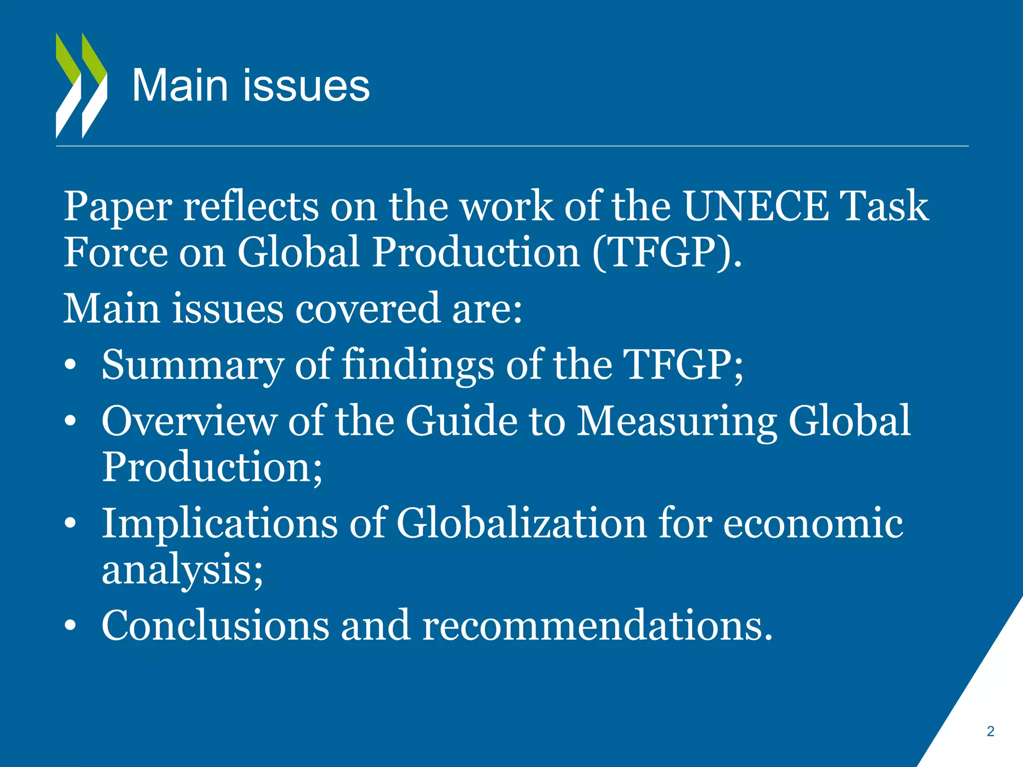 This document summarizes the findings of the UNECE Task Force on Global Production regarding the challenges of measuring global production in national accounts and balance of payments statistics. The Task Force developed a Guide to Measuring Global Production that provides a conceptual framework and typology for classifying different global production arrangements. It also provides guidance on practical issues like overcoming data gaps and accounting for large, complex multinational enterprises. The fragmentation of value chains across borders is increasingly challenging for statisticians, and global production will continue to require significant resources to adequately measure.
