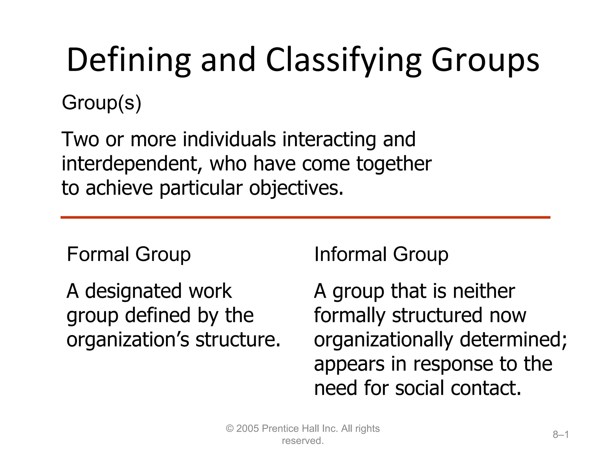 The document discusses various types of groups and teams including formal and informal groups, command groups, task groups, interest groups, and friendship groups. It describes the five stages of group development as forming, storming, norming, performing, and adjourning. It also discusses roles, norms, status, size, composition, cohesiveness, decision-making, and types of teams.