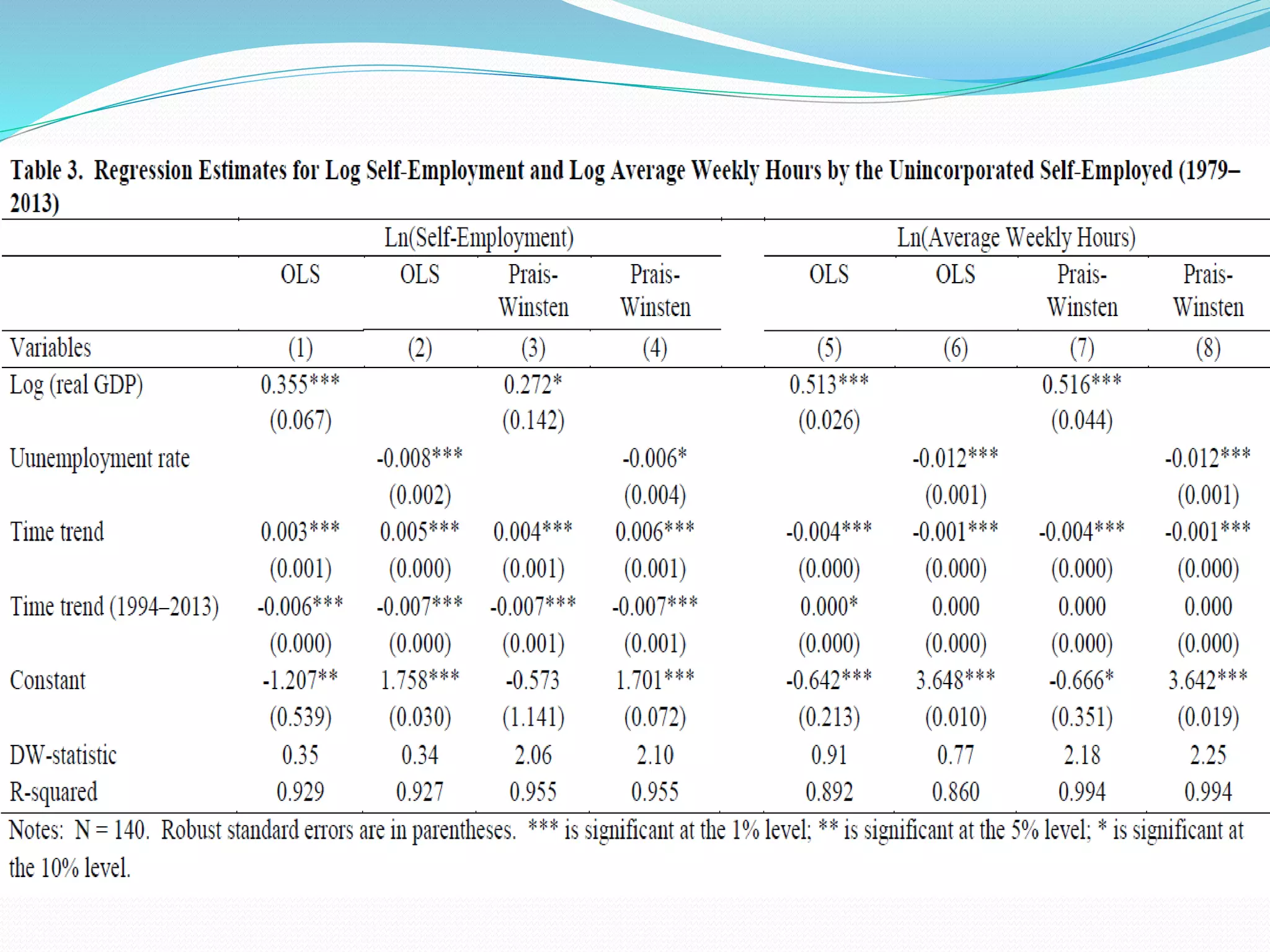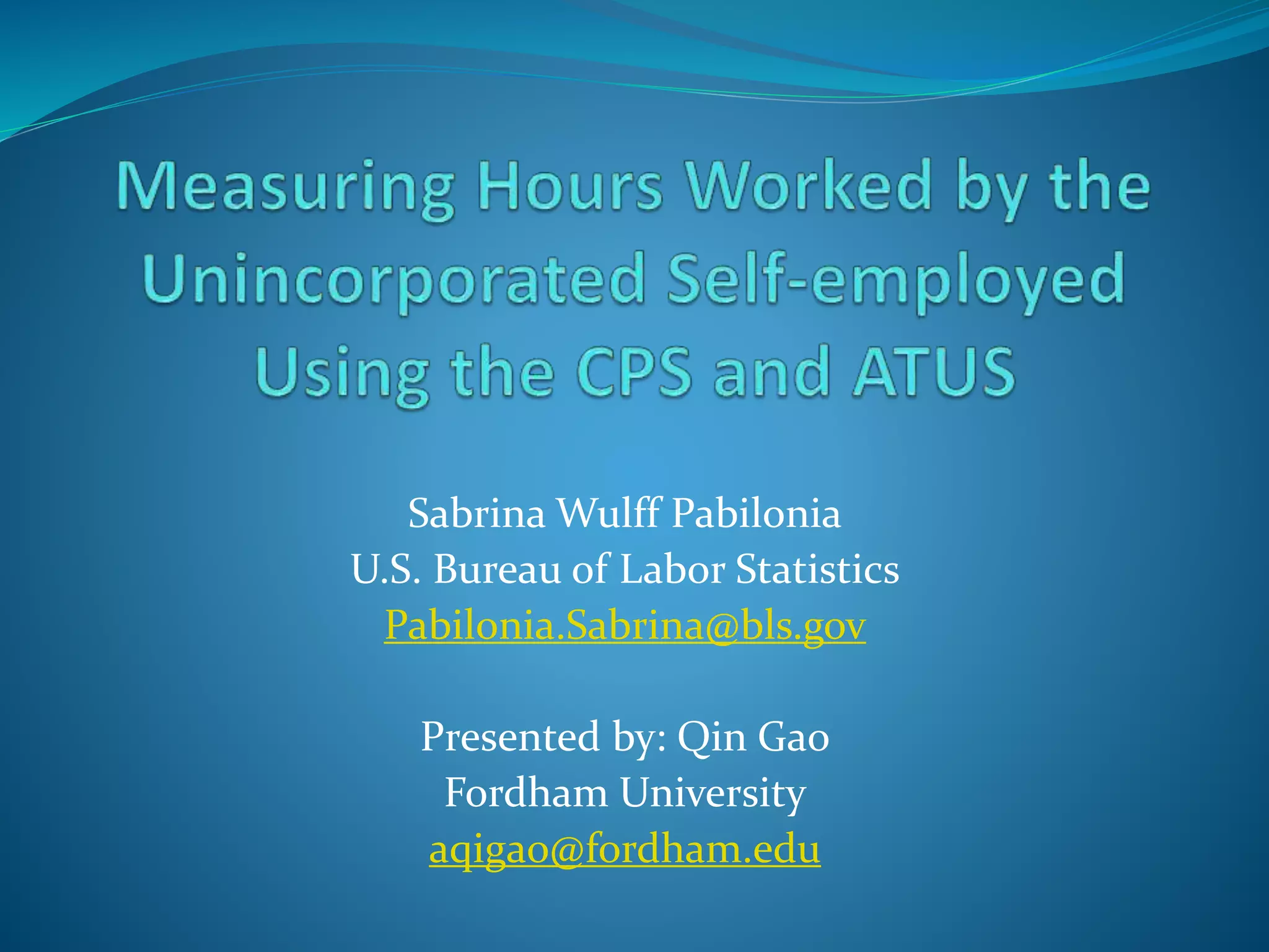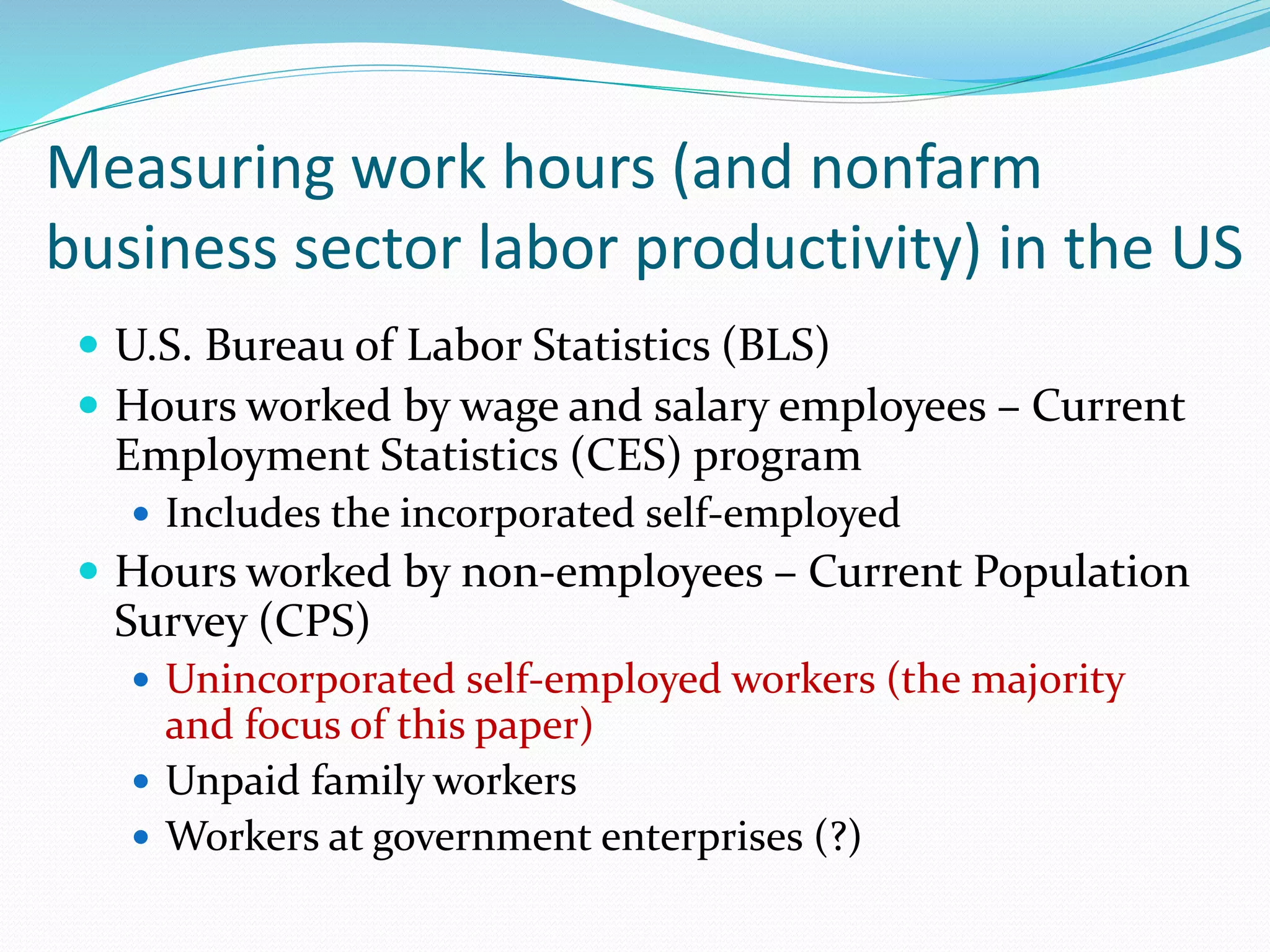 This document summarizes a research paper that examines the work hours of unincorporated self-employed workers in the US using data from the Current Population Survey (CPS) and American Time Use Survey (ATUS). The paper finds that (1) work hours of the unincorporated self-employed are procyclical and correlate with GDP and unemployment rates, and (2) the ATUS data provides a more accurate measure of work hours for this group than the CPS, though both surveys have limitations. The paper also discusses two competing theories about how self-employment relates to the business cycle and aims to determine which theory the data supports.