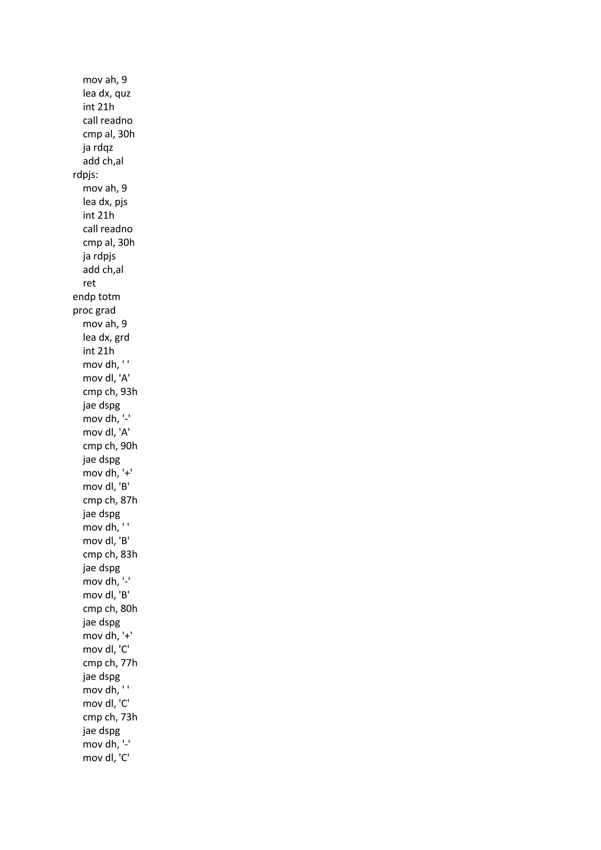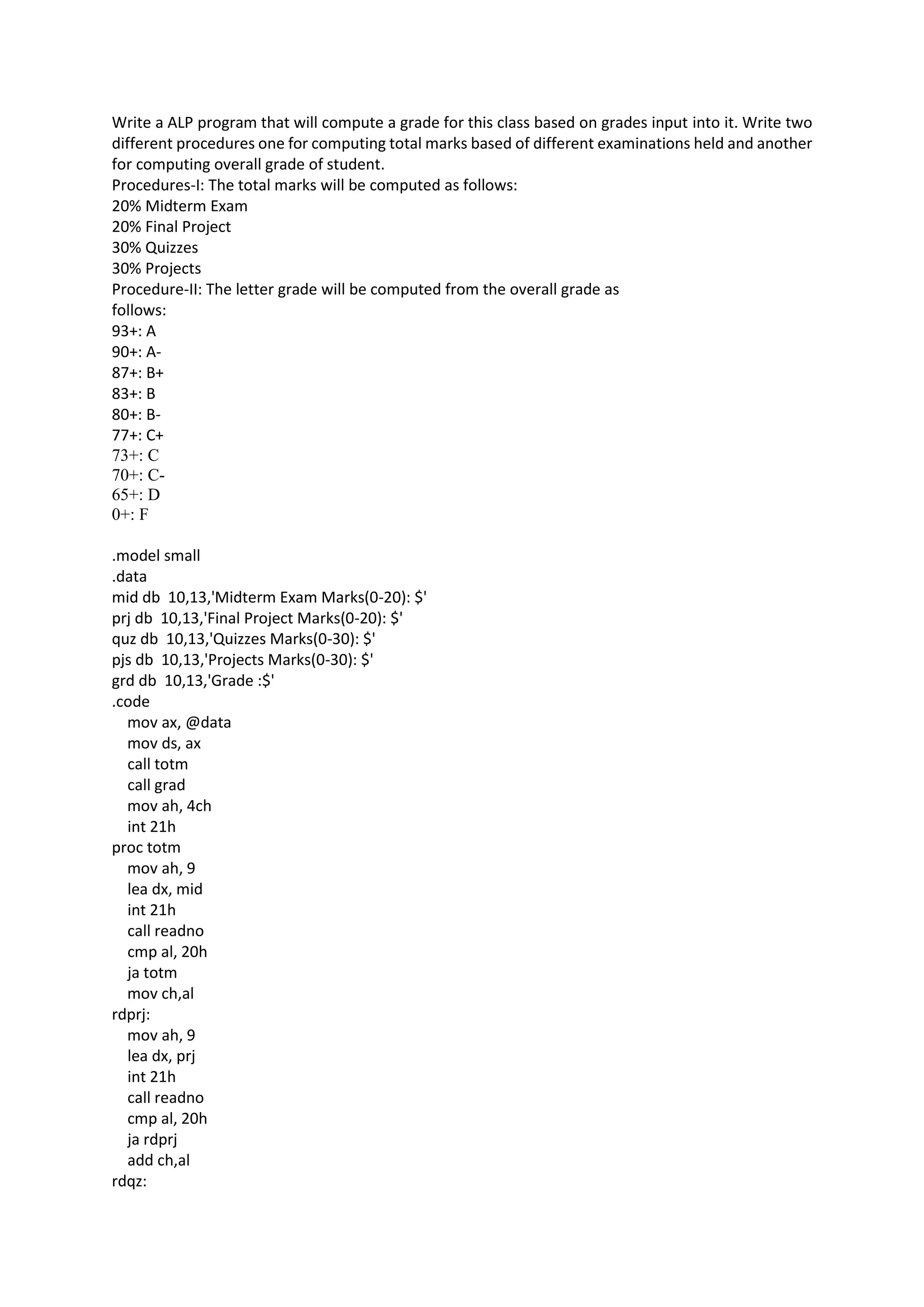 This program contains two procedures to calculate a student's grade. The first procedure calculates the total marks based on percentages from midterm, final project, quizzes and projects. The second procedure calculates the letter grade based on ranges of the total marks from A+ to F. User input for the marks is taken and overall grade is displayed.