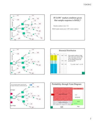 The document discusses using expected value in decision making and provides an example using a decision tree. It shows a scenario where an advertising budget can be small or large. If small, the expected profit is 46. If large, the expected profit is 68. Therefore, without sample information, the large budget should be chosen. The document then discusses taking a sample to get more information before making the decision.