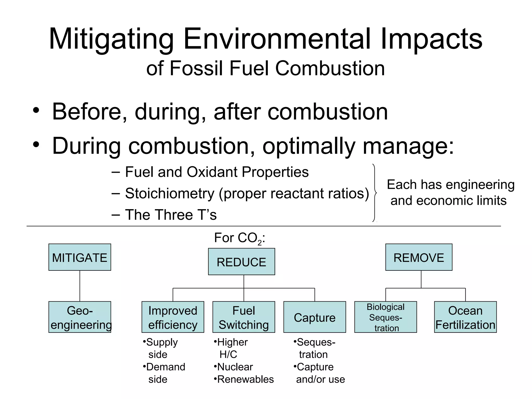 This document discusses mitigating environmental impacts and economic solutions to emissions from fossil fuel combustion. It describes strategies for reducing, improving efficiency, fuel switching, and capturing carbon dioxide emissions. It also compares carbon taxes and cap-and-trade programs, noting that cap-and-trade has precedent from the successful SO2 program that is projected to provide $100 billion in health benefits at a cost of $3 billion. Geoengineering approaches to altering the earth's reflectivity and emissivity are also briefly mentioned.