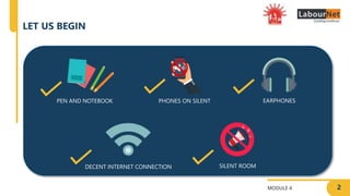 This document provides an overview of Module 4 of a training session on solar PV installation safety. It discusses what will be covered, including COVID-19 safety measures, personal protective equipment, emergency contact numbers, and measures for fire outbreaks. The module will address guidelines for safety on work sites, including proper use of masks, social distancing, sanitization, and personal protective equipment like safety shoes, helmets, and gloves. Videos are also included that demonstrate proper hand washing, mask wearing, and the importance of using complete PPE kits during installation work.