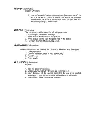 This document provides the objectives, resources, duration, and activities for a teacher training session on community and environmental health. The session aims to discuss concepts of community and environmental health at an in-depth level and express ideas about the topics. Participants will engage in interactive activities like drawing pollutants in pictures of landscapes and identifying issues in photos in order to demonstrate teaching strategies for community and environmental health.