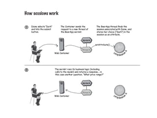 Sessions allow storing client-specific data across multiple HTTP requests. The container generates a unique session ID and sends it back to the client via a cookie. The client then sends the session ID back to the container with each subsequent request, allowing the container to identify the client and associate the appropriate session data. Cookies are commonly used to exchange the session ID between the client and container in a stateless HTTP environment.