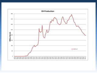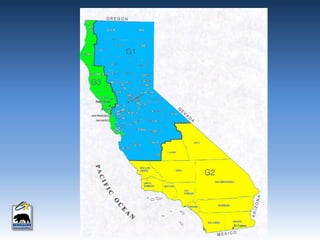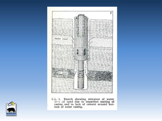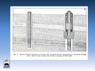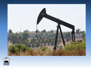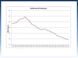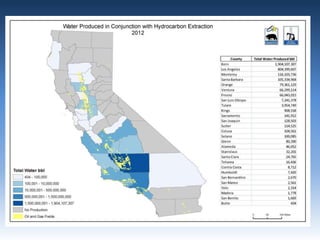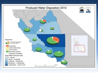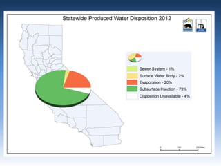 This document provides an overview of produced water in California's oil industry. It discusses the organizational structure of the Division of Oil, Gas, and Geothermal Resources, the division's mandates to regulate oil and gas development safely and prevent waste, details on well construction and plugging, underground injection control, and subsidence. It also lists the top 10 oil producing fields in 2012 and details on water injection, including amounts used for enhanced oil recovery versus water disposal. Non-injected produced water is also summarized.