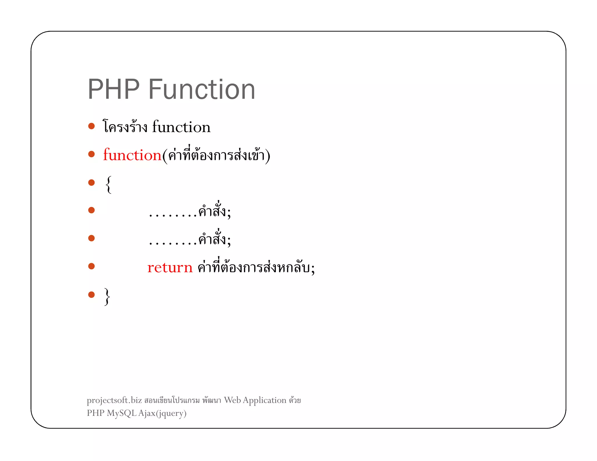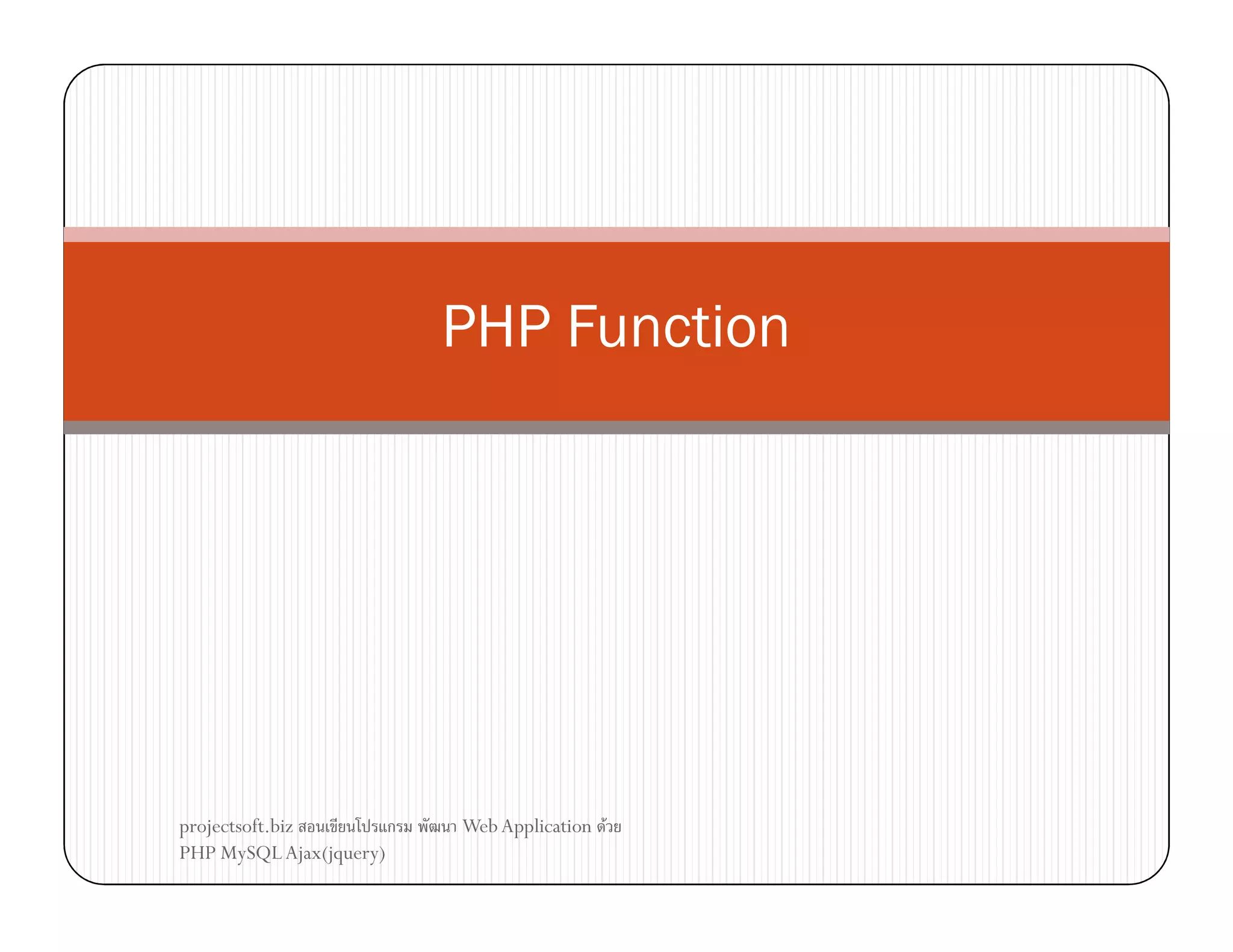 This document provides examples of using various PHP string handling and date functions. It demonstrates functions like substr(), str_replace(), strlen(), strpos(), strtolower(), strtoupper(), and date(). It also shows how to include external PHP files using the include statement to reuse code like custom functions across files.