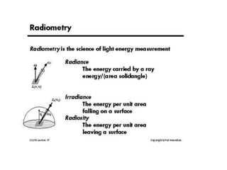 This document discusses the fundamentals of radiometry and image formation in cameras. It explains that an image measures the amount of light captured at each pixel, and describes how the pinhole camera model projects points in 3D space to 2D image coordinates. It also discusses the relationship between scene radiance and image irradiance, and defines radiance as the radiant power travelling in a given direction per unit area and solid angle. Finally, it briefly mentions specular and Lambertian reflection models, as well as more complex lighting effects like global illumination and shadows.