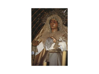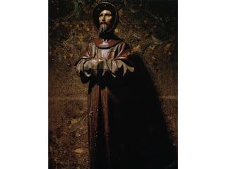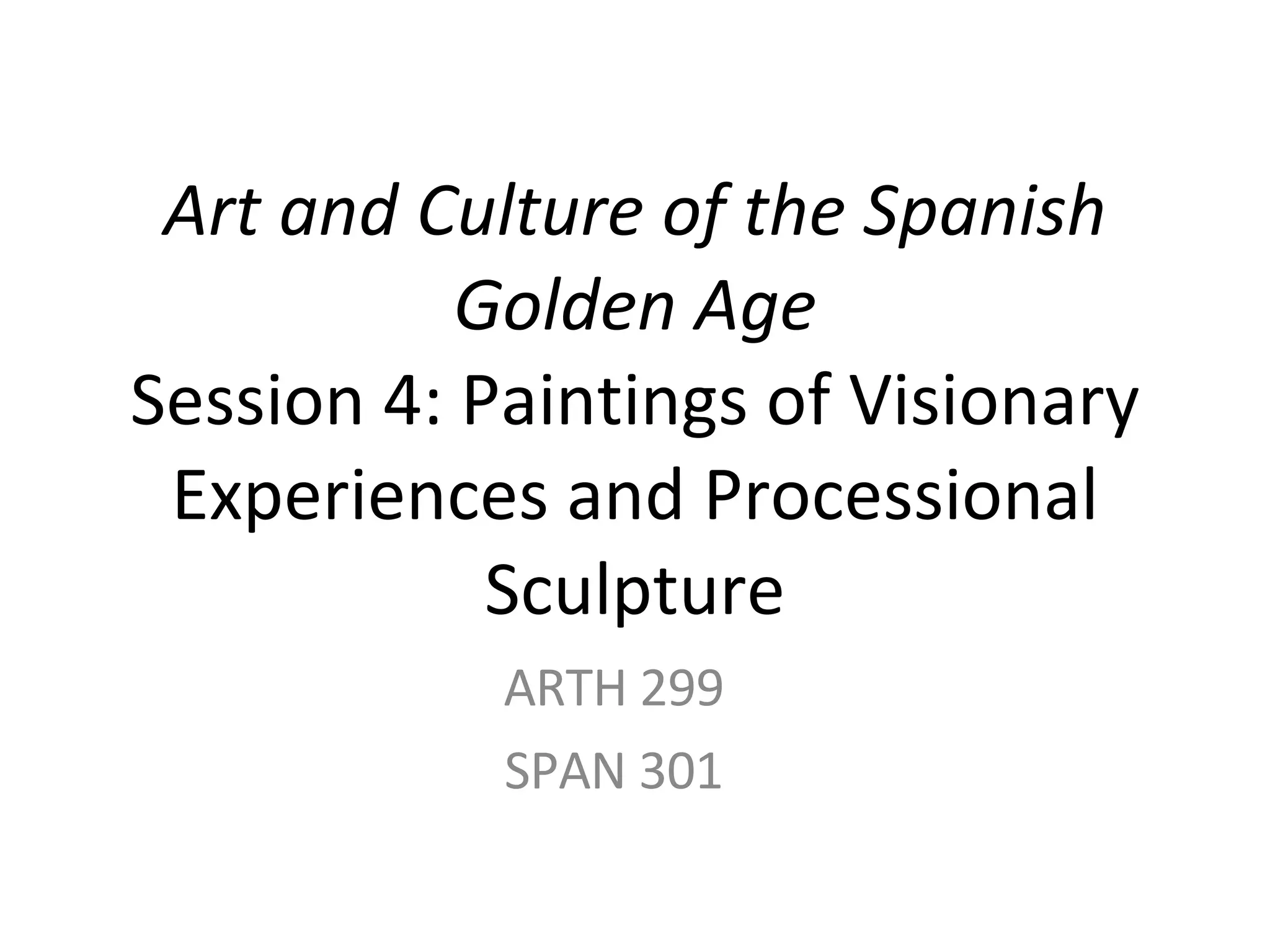 This document provides an overview of artworks from the Spanish Golden Age that depict visionary religious experiences and processional sculptures. It lists several paintings from the early 17th century by artists like Alonso Cano, Juan Ribalta, and Diego Velázquez that illustrate saints having visions of God or Jesus. It also mentions processional sculptures from the late 16th to early 18th centuries depicting figures like the Virgin Mary and Christ that were featured in Holy Week parades.