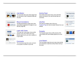 Facebook now has over 800 million active users, making it the third largest "country" in the world. Businesses can use Facebook Pages to share content like status updates, photos, and videos to interact with fans. Facebook Advertising allows targeting users based on location, interests, and other factors to promote the business Page or drive traffic to other websites and apps. The Open Graph protocol enables websites to integrate their content into the Facebook social graph, turning web pages into objects that can be shared.