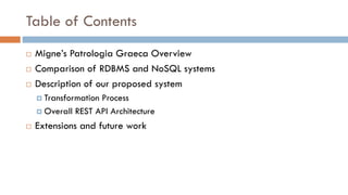 This document outlines the implementation of a databaseless web REST API for Migne's Patrologia Graeca, focusing on its ability to search unstructured texts. It compares RDBMS and NoSQL systems, describes the auto-transformation process of textual data into JSON files, and discusses the overall system architecture. Additionally, it highlights potential extensions for semantic enrichment and offers insight into future developments for the API.