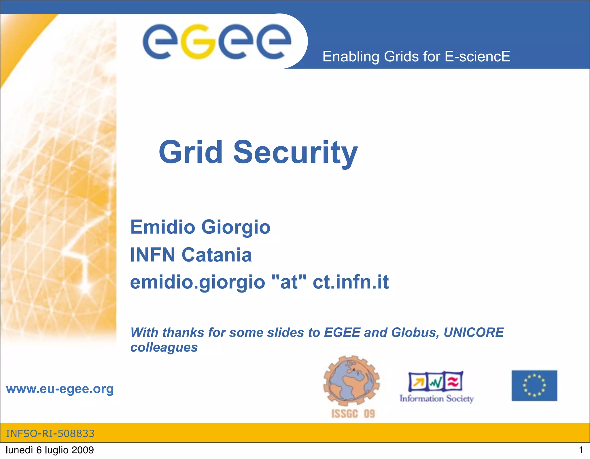 This document discusses grid security and the Grid Security Infrastructure (GSI). It explains that GSI uses public key infrastructure (PKI) to provide security at the network level through authentication using digital certificates and signatures. It describes how virtual organizations are used to authorize access and resources for groups of users and systems. The document outlines the certificate issuance process, including generating a key pair, obtaining a digital certificate from a certification authority, and exporting the certificate to different formats for use in grid middleware.