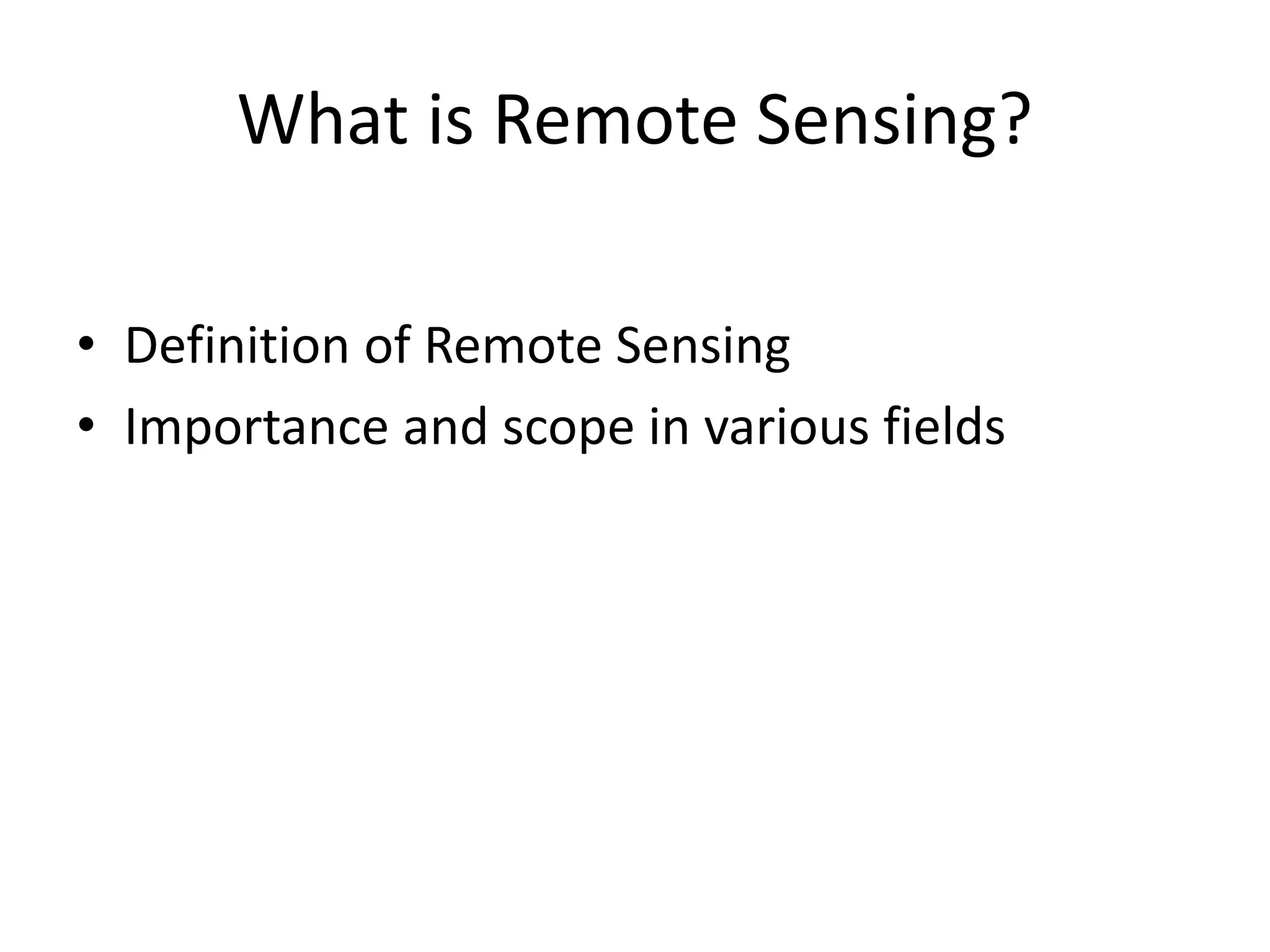 The document outlines an introduction to remote sensing within the context of a B.Tech program focused on climate action. It covers definitions, the electromagnetic spectrum, types of remote sensing, and various applications such as environmental monitoring and agriculture. Additionally, it highlights specific examples and case studies of remote sensing in addressing climate change.