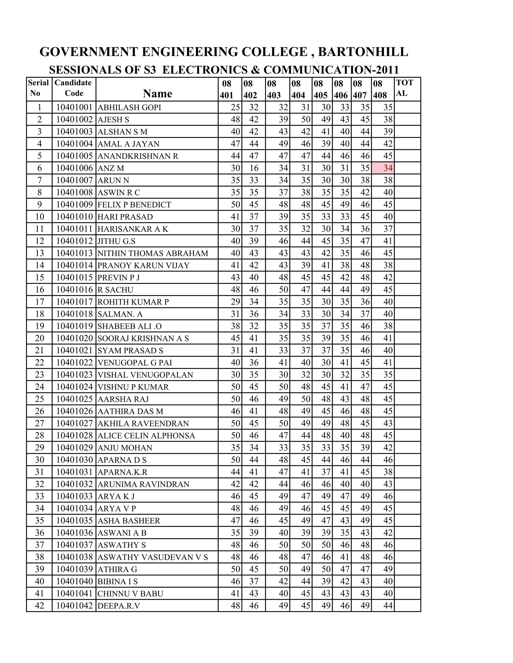 The document appears to be a record of sessional exam scores for students in an Electronics and Communication engineering program. It lists the serial numbers, student codes and names, and individual scores on 8 sessional exams for 71 students. The highest possible score is 50. Many students scored in the mid to high 40s, with a few perfect scores of 50 on several exams.