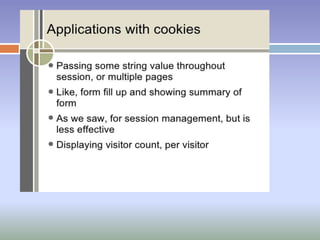 Session management is needed in web applications to maintain state across HTTP requests. Cookies and session variables are two techniques used to manage state. Session variables store data on the server tied to a unique session ID, while cookies store small amounts of data in the user's browser. Common uses of cookies and sessions include maintaining shopping carts across pages and personalizing websites based on user preferences. Cookies reduce server load by storing some data on the client side.