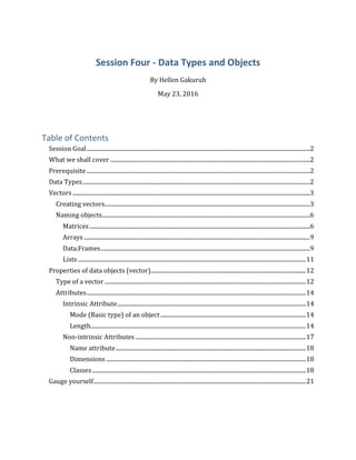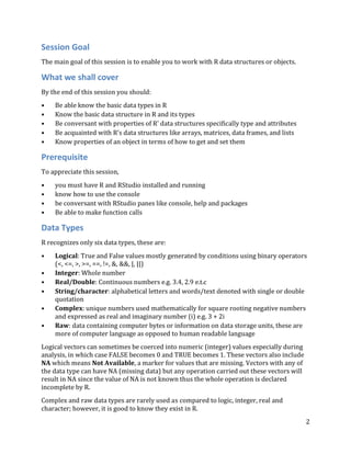 This document discusses R data types and objects. It covers the basic data types in R: logical, integer, real/double, string/character, complex, and raw. The most common data structures are vectors, matrices, arrays, data frames, and lists. Vectors can be atomic, containing one data type, or generic lists, containing multiple data types. The document demonstrates how to create vectors using the c() function or colon operator, and how to name vectors by assigning them to an object. It also discusses the basic properties of vectors like their type, length, dimensions, and classes.