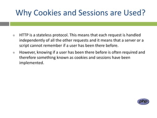 Cookies and sessions allow servers to store and retrieve information about users across multiple page requests that would otherwise be stateless. Cookies store data in the user's browser, while sessions store data on the server. Cookies have limits on size and number, while sessions can store larger objects but expire when the browser closes. PHP provides functions like setcookie() and $_SESSION to easily manage cookies and sessions for maintaining state in web applications.