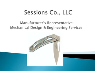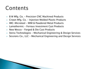 Sessions Co., LLC is a manufacturer's representative that represents several precision manufacturing companies including: B W Mfg. Co. for CNC machined products; Crown Mfg. Co. for injection molded plastic products; IMC-Microtool for metal injection molded and powdered metal products; and Lamothermic for ferrous investment cast products. These companies offer services such as CNC machining, plastic injection molding, metal injection molding, powdered metal pressing, and investment casting to produce complex parts for industries such as aerospace, automotive, medical, and more. Sessions Co. provides sales and customer support for these precision manufacturing partners.