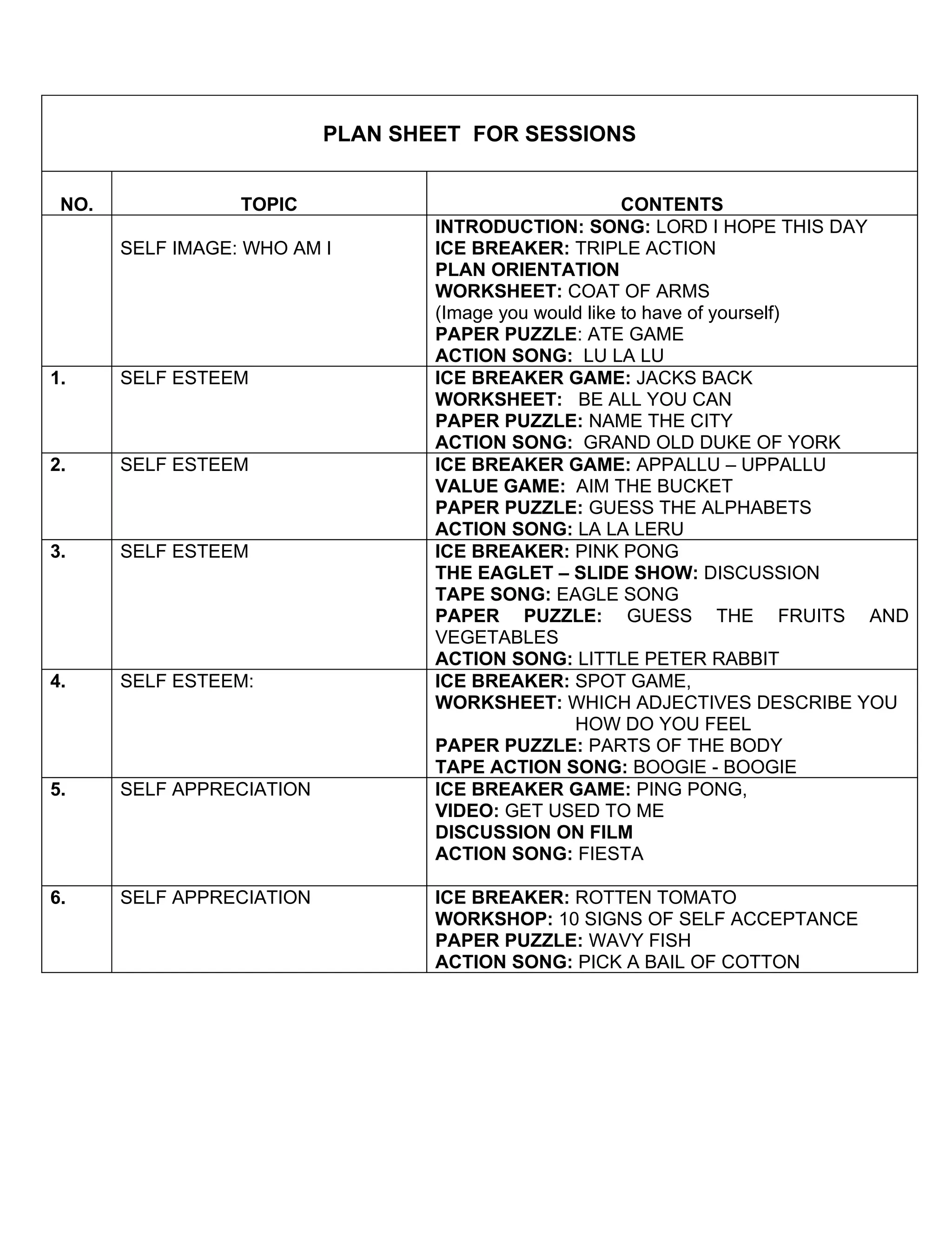 This document contains a plan sheet for self-esteem sessions with topics like self-image, self-esteem, self-appreciation, self-discovery, and relationships with others. Each session includes an icebreaker activity, worksheets, puzzles, and action songs. Worksheets provide exercises to explore personal qualities, talents, dreams, and building confidence. Puzzles and games reinforce the session topics. The goal is to help participants develop a more positive self-image and self-esteem.