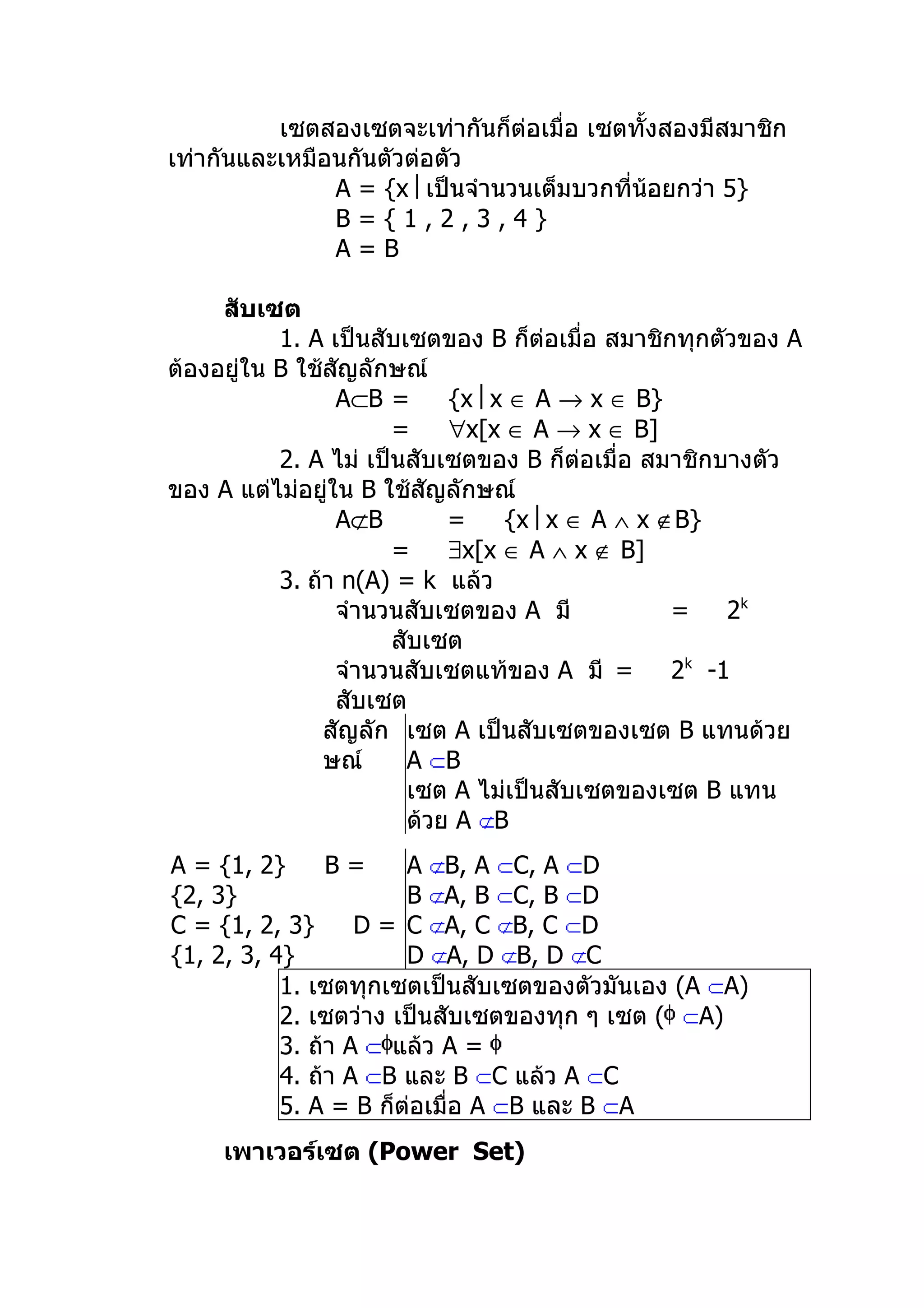 เซต(Set) เซต คือลักษณะนามที่เราใช้เรียกกลุ่มของสิ่งต่าง ๆ เช่นกลุ่มของคน สัตว์ กลุ่มของสิ่งของเป็นต้น และสิ่งต่าง ๆ ที่ อยู่ในกลุมว่า สมาชิก ่ ใช้อักษรในภาษาอังกฤษตัวพิมพ์ใหญ่แทนชื่อเซต อักษรในภาษาอังกฤษตัวพิมพ์เล็ก ตัวเลข เขียนสมาชิกของเซต เมื่อเรากล่าวถึงเซต จะต้องกล่าวถึงสมาชิกในเซตซึ่งอาจจะมีหรือ ไม่มีก็ได้ ถ้ามีก็ต้องทราบว่ามีอะไรบ้าง ดังนั้นการเขียนเซตจึง จำาแนกได้ 2 แบบ ตามวิธีการเขียนสมาชิก 1. การเขียนเซตแบบแจกแจงสมาชิก วิธีการเขียนแบบนี้จะเขียนสมาชิก ของเซตในวงเล็บปีกกา และคั่นเครื่องหมายจุลภาค “ , ” และ A = เซตของวันในหนึงสัปดาห์ ่ A={ จันทร์,อังคาร,พุธ,พฤหัสบดี,ศุกร์,เสาร์,อาทิตย์} 2. การเขียนเซตแบบบอกเงื่อนไขของสมาชิก วิธีเขียนแบบนี้เรานิยมใช้ตัวแปร x , y ,z แทนสมาชิก หลังจากนั้นใช้เส้นคั่นและต่อจากเส้นคั่นจะเป็นส่วน อธิบายเกี่ยวกับเงื่อนไขของสมาชิก A = {x x เป็นวันในหนึ่งสัปดาห์} A={ จันทร์,อังคาร,พุธ,พฤหัสบดี,ศุกร์,เสาร์,อาทิตย์} ใช้สัญลักษณ์ “ ” แทนคำาว่า “ เป็นสมาชิกของ” เช่น B = { x x เป็นสระในภาษาอังกฤษ} B={a,e,i,o,u} a ∈A , e ∈ A , i∈A , o∈A , u∈A ชนิดของเซต 1. เซตว่าง (Empty Set ) คือเซตที่ไม่มีสมาชิกเลย ใช้สัญลักษณ์ { } หรือ 2. เซตจำากัด( Finite Set) คือเซตที่สามารถบอกได้ว่า มีสมาชิกเป็นจำานวนเท่าใด 3. เซตอนันต์ (Infinity Set) คือเซตที่ไม่ใช่เซตจำากัด การเท่ากันของเซต