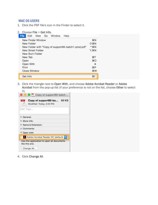 To set Acrobat Reader DC or Acrobat DC as the default PDF viewer on Windows, right-click a PDF, select Open With, choose the Adobe program from the list, and select Always use this app to open .pdf files. For Mac, select a PDF in the Finder, choose File > Get Info, select the Adobe program from the Open With pop-up, and click Change All. This will configure your system to automatically open PDFs with the selected Adobe application by default.