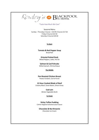 This document is a seasonal menu for a restaurant offering 2 or 3 course meals on different days of the week at varying prices. On Sundays through Thursdays customers can choose between a 2 course meal for £14.95 or a 3 course meal for £17.50. On Fridays only a 3 course meal is available for £22.50 and Saturdays are also 3 courses for £24.50. The menu lists starter, main, and dessert options including soups, fishcakes, chicken, beef, cod, and desserts like sticky toffee pudding and brownies.