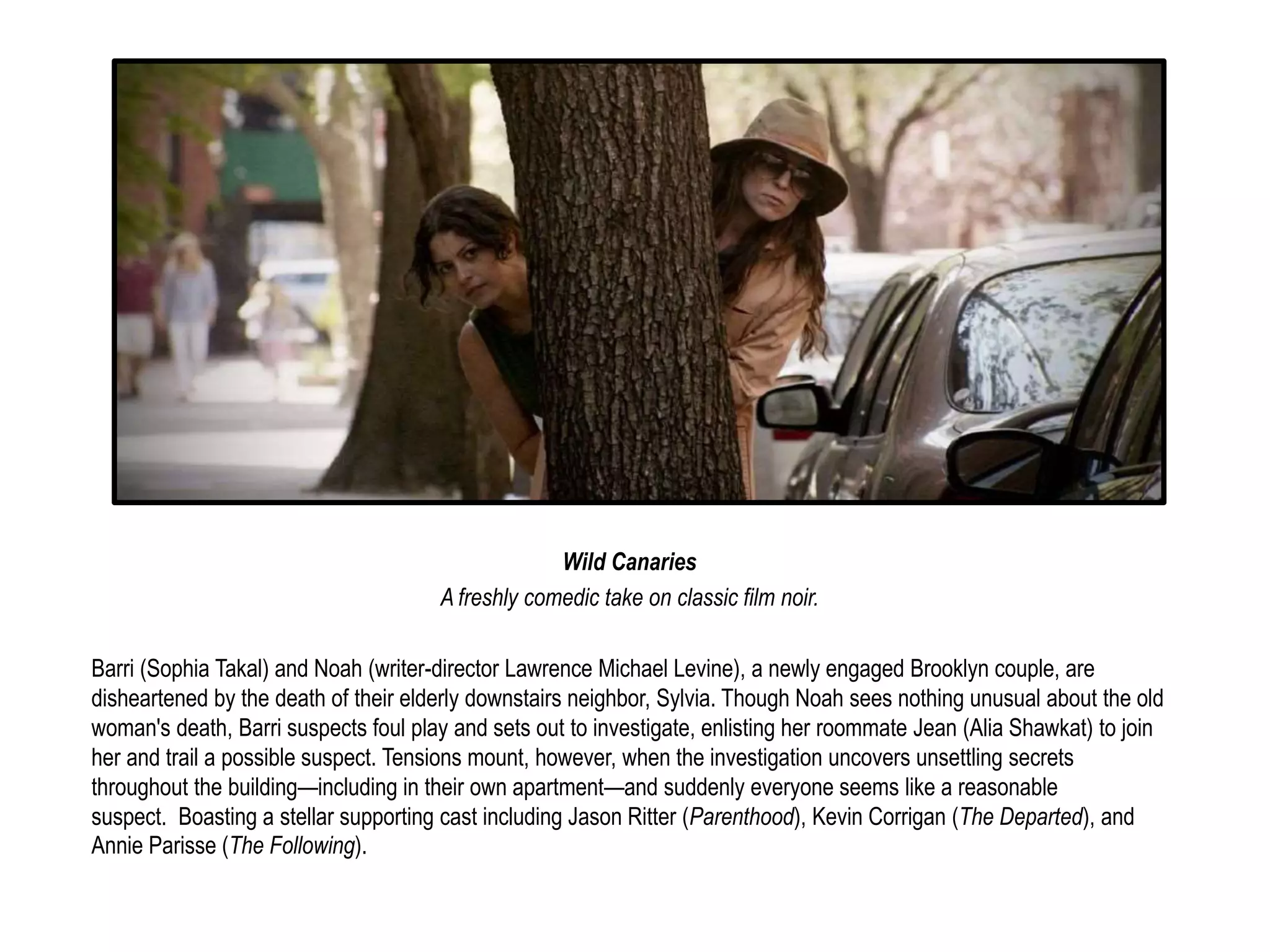 The document reviews several films, highlighting their themes and plots. 'Wild Canaries' features a couple investigating a suspicious death in their building, while 'Damnation' examines the shift in attitudes towards dam removal and its environmental impacts. Other films like 'Sweet Dreams', 'The Dark Valley', and 'Ida' explore themes of resilience, tradition, and identity against historical backdrops, each presenting unique narratives that reflect human experiences.