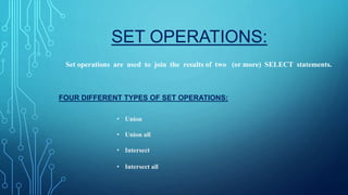 Set operations allow combining results from multiple SELECT statements. There are four main types: