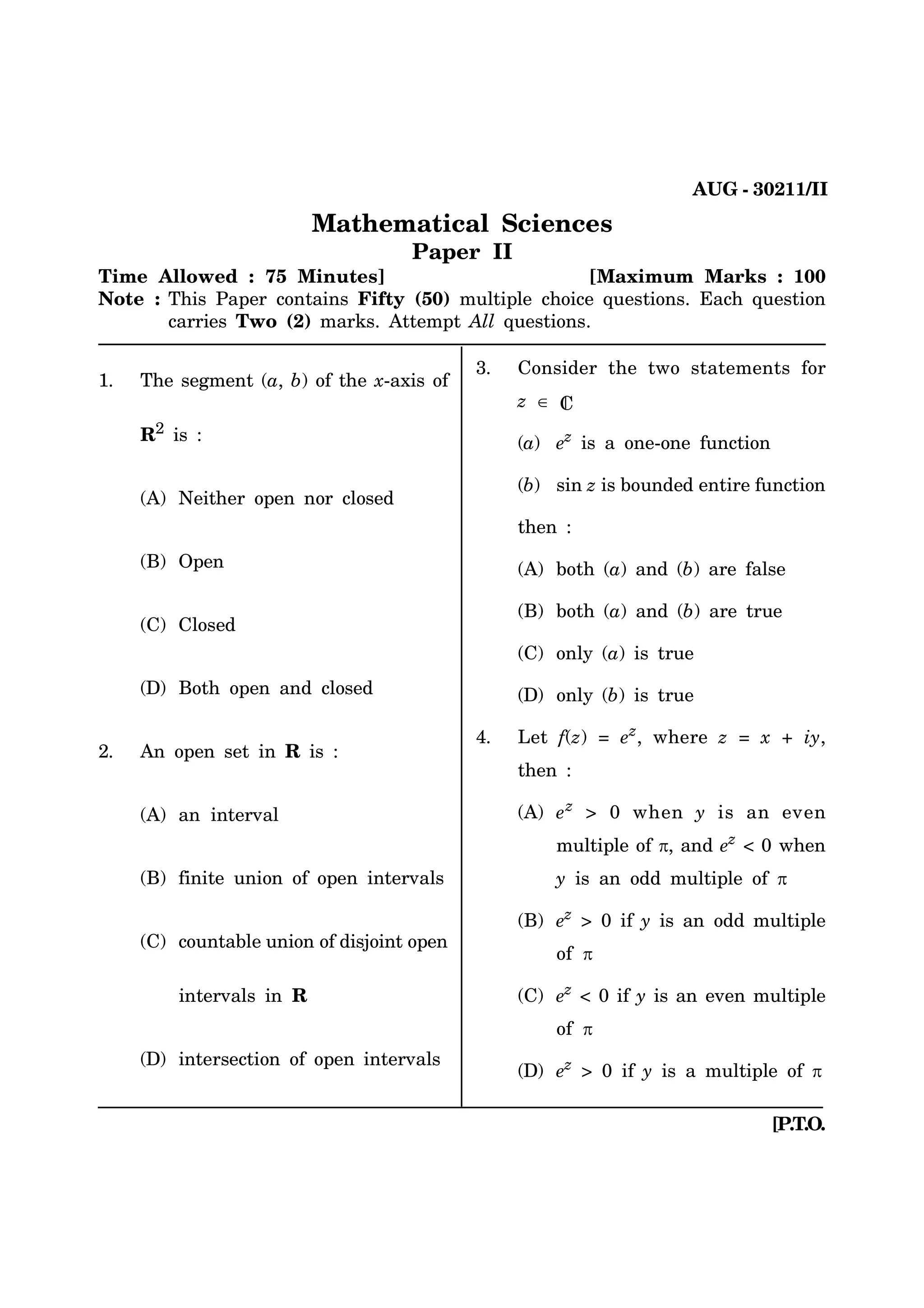 This document contains 50 multiple choice questions with 2 marks each. Each question has 4 answer choices, only one of which is correct. The questions cover a range of mathematical and statistical topics such as functions, intervals, probability distributions, linear algebra and optimization.