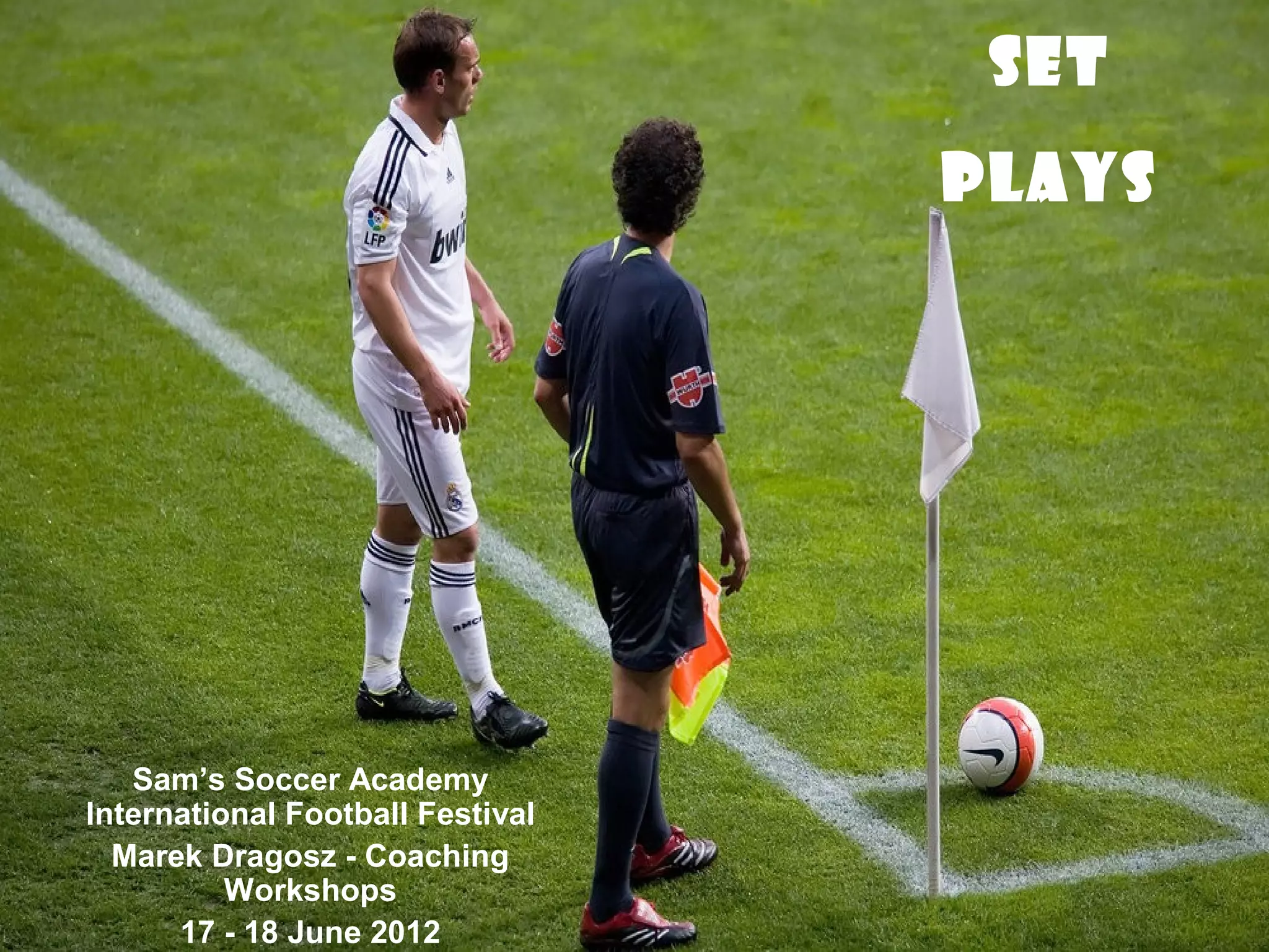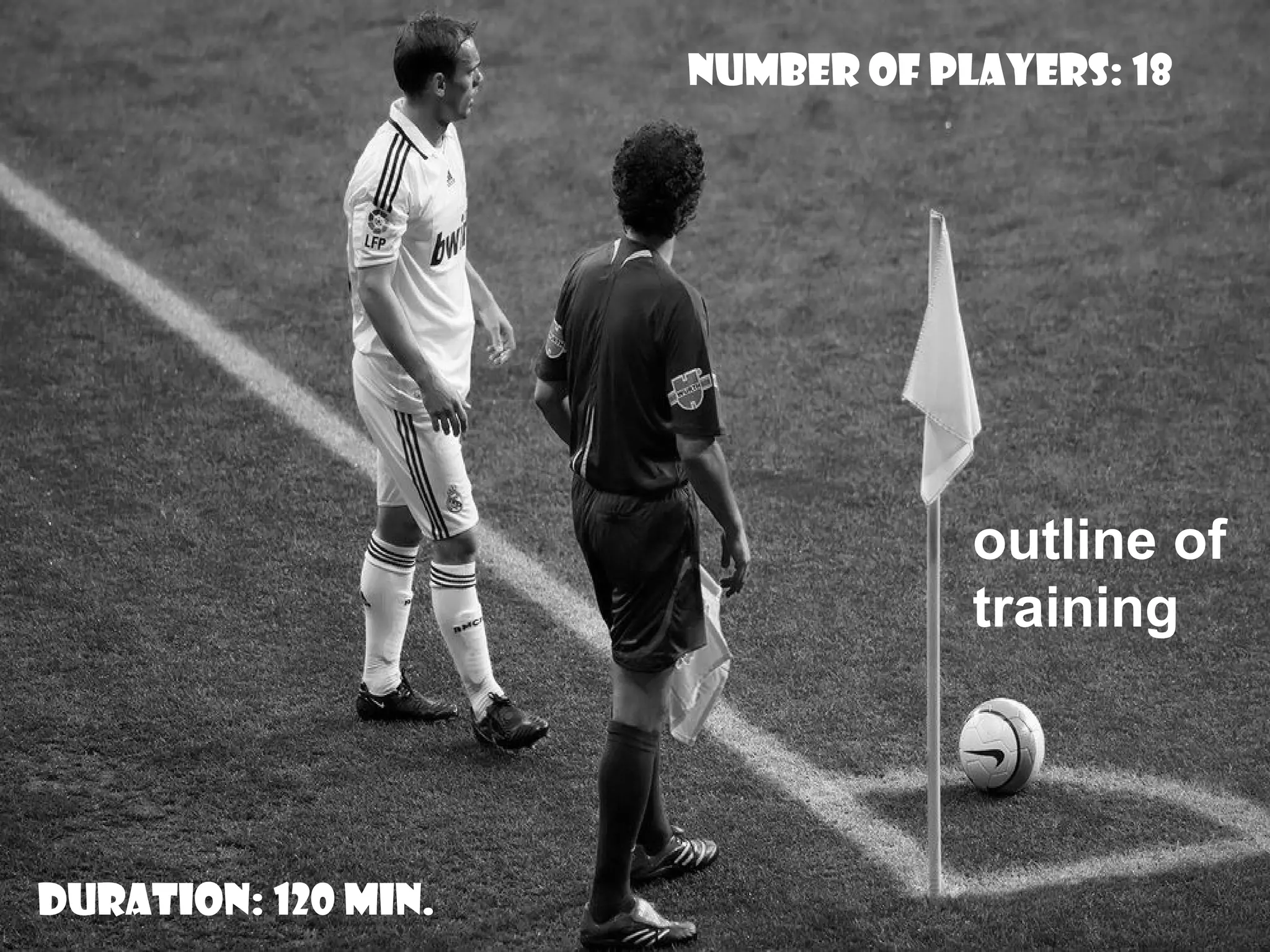 This document provides an outline for a 120 minute soccer training session consisting of various drills and exercises. The session includes a warm up with running and stretching exercises. Then it describes several small sided games focusing on set plays like open play, free kicks, corners, and throw ins. It also includes a short tactical game and a penalty kick drill. The training ends with a cool down period.
