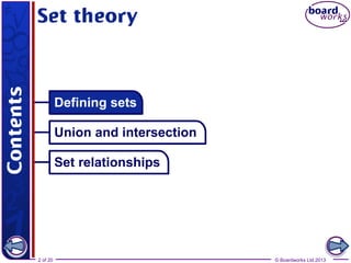 The document provides an overview of sets in mathematics, discussing elements, unions, intersections, and complements. It explains key concepts such as disjoint sets, subsets, and the universal set, illustrated with various examples. Additionally, it mentions how to represent these concepts through Venn diagrams and calculates the number of elements in sets.