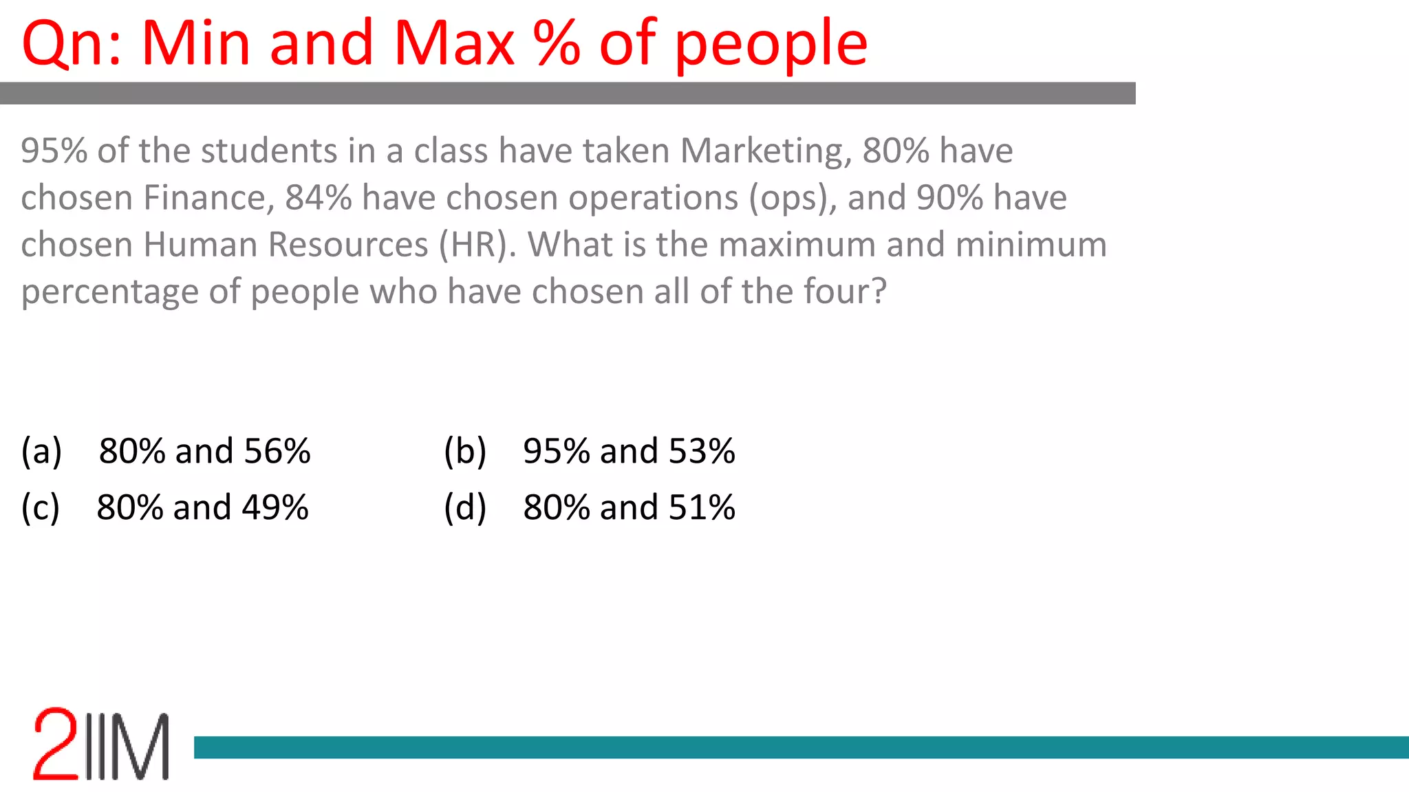 The document discusses the maximum and minimum percentages of students who have taken four subjects: marketing, finance, operations, and human resources. The maximum percentage of students taking all four subjects is 80%, while the minimum is calculated to be 49% through various iterations and formula applications. It emphasizes that understanding through trial and error is beneficial over solely relying on formulas.
