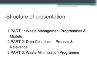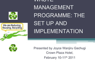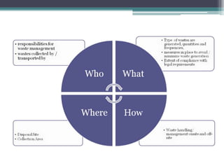 This document outlines the key steps for setting up and implementing an effective waste management program, including: