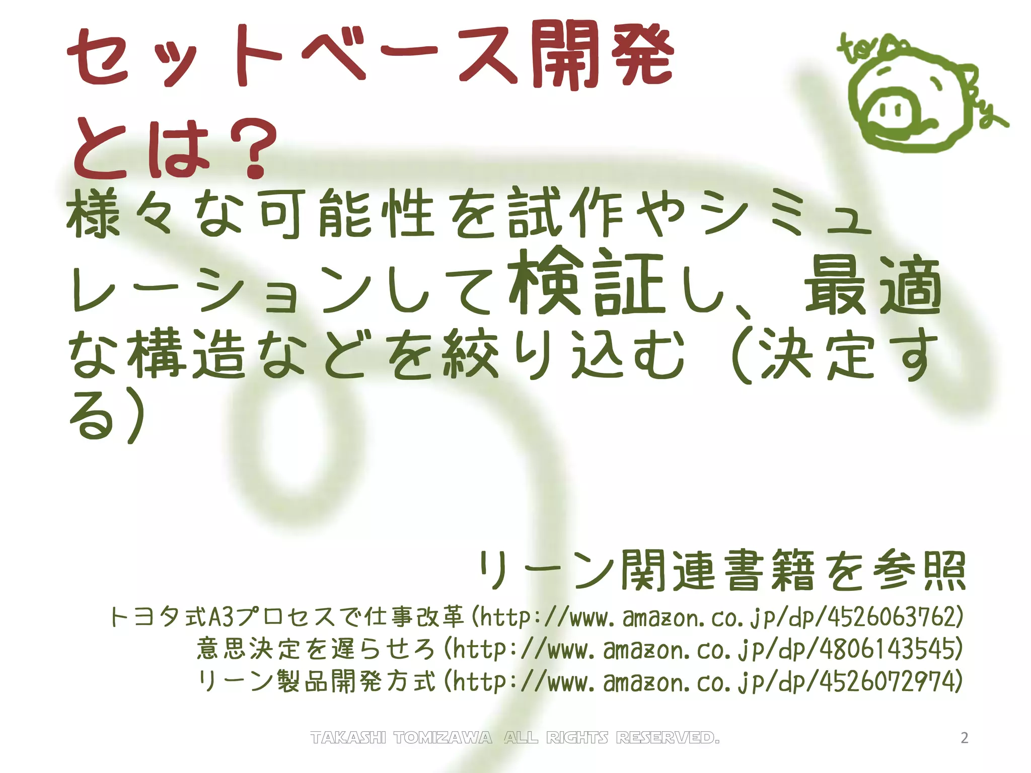 なぜ、セットベース開発 か?! ソフトウェア開発においても上 流で様々な可能性を検証する 必要がある!! レビューではなく、検証した い! Takashi tomizawa All
