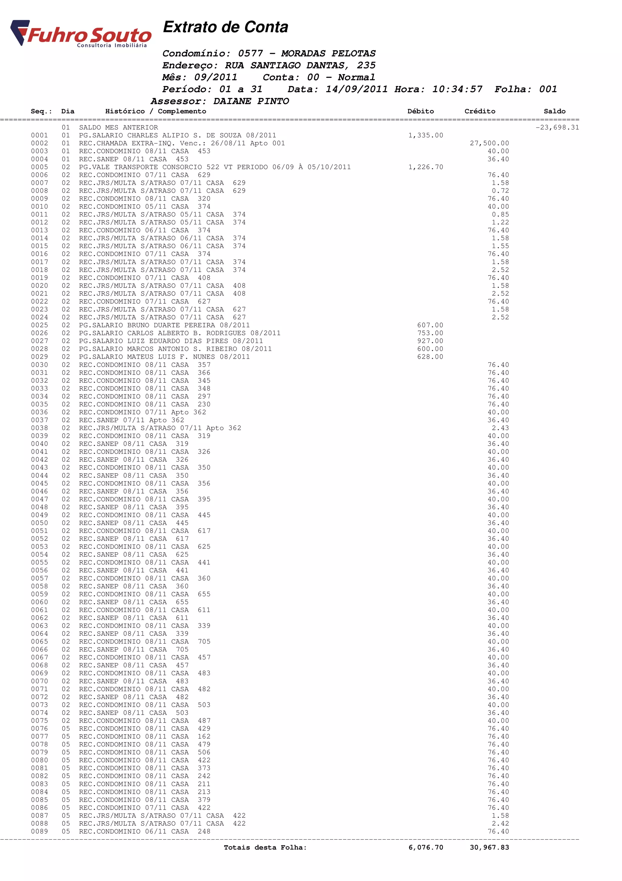 Condomínio: 0577 - MORADAS PELOTAS Endereço: RUA SANTIAGO DANTAS, 235 Mês: 09/2011 Conta: 00 - Normal Período: 01 a 31 Data: 14/09/2011 Hora: 10:34:57 Folha: 001 Assessor: DAIANE PINTO Seq.: Dia Histórico / Complemento Débito Crédito Saldo ==================================================================================================================================== 01 SALDO MES ANTERIOR -23,698.31 0001 01 PG.SALARIO CHARLES ALIPIO S. DE SOUZA 08/2011 1,335.00 0002 01 REC.CHAMADA EXTRA-INQ. Venc.: 26/08/11 Apto 001 27,500.00 0003 01 REC.CONDOMINIO 08/11 CASA 453 40.00 0004 01 REC.SANEP 08/11 CASA 453 36.40 0005 02 PG.VALE TRANSPORTE CONSORCIO 522 VT PERIODO 06/09 À 05/10/2011 1,226.70 0006 02 REC.CONDOMINIO 07/11 CASA 629 76.40 0007 02 REC.JRS/MULTA S/ATRASO 07/11 CASA 629 1.58 0008 02 REC.JRS/MULTA S/ATRASO 07/11 CASA 629 0.72 0009 02 REC.CONDOMINIO 08/11 CASA 320 76.40 0010 02 REC.CONDOMINIO 05/11 CASA 374 40.00 0011 02 REC.JRS/MULTA S/ATRASO 05/11 CASA 374 0.85 0012 02 REC.JRS/MULTA S/ATRASO 05/11 CASA 374 1.22 0013 02 REC.CONDOMINIO 06/11 CASA 374 76.40 0014 02 REC.JRS/MULTA S/ATRASO 06/11 CASA 374 1.58 0015 02 REC.JRS/MULTA S/ATRASO 06/11 CASA 374 1.55 0016 02 REC.CONDOMINIO 07/11 CASA 374 76.40 0017 02 REC.JRS/MULTA S/ATRASO 07/11 CASA 374 1.58 0018 02 REC.JRS/MULTA S/ATRASO 07/11 CASA 374 2.52 0019 02 REC.CONDOMINIO 07/11 CASA 408 76.40 0020 02 REC.JRS/MULTA S/ATRASO 07/11 CASA 408 1.58 0021 02 REC.JRS/MULTA S/ATRASO 07/11 CASA 408 2.52 0022 02 REC.CONDOMINIO 07/11 CASA 627 76.40 0023 02 REC.JRS/MULTA S/ATRASO 07/11 CASA 627 1.58 0024 02 REC.JRS/MULTA S/ATRASO 07/11 CASA 627 2.52 0025 02 PG.SALARIO BRUNO DUARTE PEREIRA 08/2011 607.00 0026 02 PG.SALARIO CARLOS ALBERTO B. RODRIGUES 08/2011 753.00 0027 02 PG.SALARIO LUIZ EDUARDO DIAS PIRES 08/2011 927.00 0028 02 PG.SALARIO MARCOS ANTONIO S. RIBEIRO 08/2011 600.00 0029 02 PG.SALARIO MATEUS LUIS F. NUNES 08/2011 628.00 0030 02 REC.CONDOMINIO 08/11 CASA 357 76.40 0031 02 REC.CONDOMINIO 08/11 CASA 366 76.40 0032 02 REC.CONDOMINIO 08/11 CASA 345 76.40 0033 02 REC.CONDOMINIO 08/11 CASA 348 76.40 0034 02 REC.CONDOMINIO 08/11 CASA 297 76.40 0035 02 REC.CONDOMINIO 08/11 CASA 230 76.40 0036 02 REC.CONDOMINIO 07/11 Apto 362 40.00 0037 02 REC.SANEP 07/11 Apto 362 36.40 0038 02 REC.JRS/MULTA S/ATRASO 07/11 Apto 362 2.43 0039 02 REC.CONDOMINIO 08/11 CASA 319 40.00 0040 02 REC.SANEP 08/11 CASA 319 36.40 0041 02 REC.CONDOMINIO 08/11 CASA 326 40.00 0042 02 REC.SANEP 08/11 CASA 326 36.40 0043 02 REC.CONDOMINIO 08/11 CASA 350 40.00 0044 02 REC.SANEP 08/11 CASA 350 36.40 0045 02 REC.CONDOMINIO 08/11 CASA 356 40.00 0046 02 REC.SANEP 08/11 CASA 356 36.40 0047 02 REC.CONDOMINIO 08/11 CASA 395 40.00 0048 02 REC.SANEP 08/11 CASA 395 36.40 0049 02 REC.CONDOMINIO 08/11 CASA 445 40.00 0050 02 REC.SANEP 08/11 CASA 445 36.40 0051 02 REC.CONDOMINIO 08/11 CASA 617 40.00 0052 02 REC.SANEP 08/11 CASA 617 36.40 0053 02 REC.CONDOMINIO 08/11 CASA 625 40.00 0054 02 REC.SANEP 08/11 CASA 625 36.40 0055 02 REC.CONDOMINIO 08/11 CASA 441 40.00 0056 02 REC.SANEP 08/11 CASA 441 36.40 0057 02 REC.CONDOMINIO 08/11 CASA 360 40.00 0058 02 REC.SANEP 08/11 CASA 360 36.40 0059 02 REC.CONDOMINIO 08/11 CASA 655 40.00 0060 02 REC.SANEP 08/11 CASA 655 36.40 0061 02 REC.CONDOMINIO 08/11 CASA 611 40.00 0062 02 REC.SANEP 08/11 CASA 611 36.40 0063 02 REC.CONDOMINIO 08/11 CASA 339 40.00 0064 02 REC.SANEP 08/11 CASA 339 36.40 0065 02 REC.CONDOMINIO 08/11 CASA 705 40.00 0066 02 REC.SANEP 08/11 CASA 705 36.40 0067 02 REC.CONDOMINIO 08/11 CASA 457 40.00 0068 02 REC.SANEP 08/11 CASA 457 36.40 0069 02 REC.CONDOMINIO 08/11 CASA 483 40.00 0070 02 REC.SANEP 08/11 CASA 483 36.40 0071 02 REC.CONDOMINIO 08/11 CASA 482 40.00 0072 02 REC.SANEP 08/11 CASA 482 36.40 0073 02 REC.CONDOMINIO 08/11 CASA 503 40.00 0074 02 REC.SANEP 08/11 CASA 503 36.40 0075 02 REC.CONDOMINIO 08/11 CASA 487 40.00 0076 05 REC.CONDOMINIO 08/11 CASA 429 76.40 0077 05 REC.CONDOMINIO 08/11 CASA 162 76.40 0078 05 REC.CONDOMINIO 08/11 CASA 479 76.40 0079 05 REC.CONDOMINIO 08/11 CASA 506 76.40 0080 05 REC.CONDOMINIO 08/11 CASA 422 76.40 0081 05 REC.CONDOMINIO 08/11 CASA 373 76.40 0082 05 REC.CONDOMINIO 08/11 CASA 242 76.40 0083 05 REC.CONDOMINIO 08/11 CASA 211 76.40 0084 05 REC.CONDOMINIO 08/11 CASA 213 76.40 0085 05 REC.CONDOMINIO 08/11 CASA 379 76.40 0086 05 REC.CONDOMINIO 07/11 CASA 422 76.40 0087 05 REC.JRS/MULTA S/ATRASO 07/11 CASA 422 1.58 0088 05 REC.JRS/MULTA S/ATRASO 07/11 CASA 422 2.42 0089 05 REC.CONDOMINIO 06/11 CASA 248 76.40 ------------------------------------------------------------------------------------------------------------------------------------ Totais desta Folha: 6,076.70 30,967.83