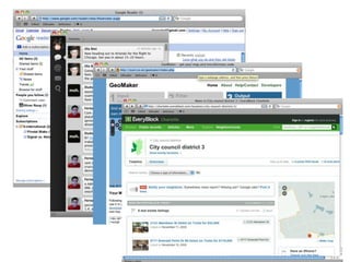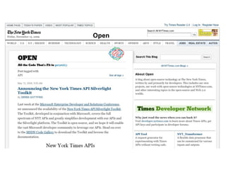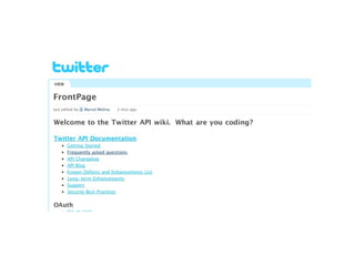 The document discusses the development of web applications using APIs and distributed data. It explains how web applications are built by combining data, manipulation, and presentation layers. APIs provide access to data from external sources, and technologies like YQL and Yahoo services can be used to retrieve and format data. Sharing tools and data can help improve applications and reach more users.