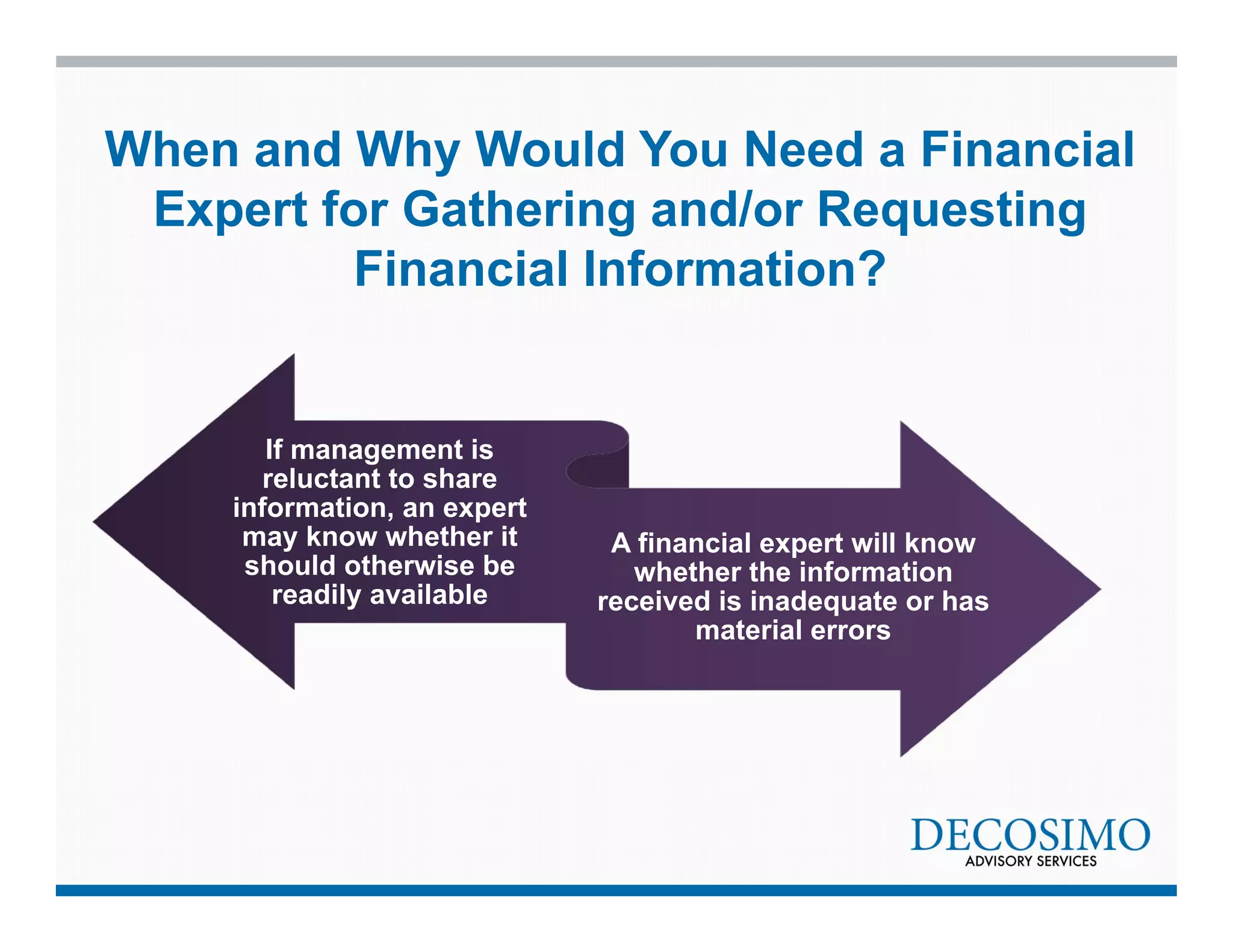 This document discusses financial statement analysis and the information that a financial expert may request when analyzing statements. It provides: