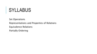 This document defines and explains various concepts related to sets and relations. It discusses the four main set operations of union, intersection, complement, and difference. It then explains eight types of relations: empty, universal, identity, inverse, reflexive, symmetric, transitive, and equivalence relations. Finally, it defines partial ordering as a relation that is reflexive, antisymmetric, and transitive.