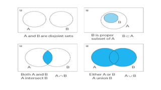 The document explains the concepts of sets, functions, and relations in mathematics, detailing four main set operations: union, intersection, complement, and difference. It defines a function as a relation where each input has a single output and discusses various types of relations such as empty, universal, identity, reflexive, symmetric, transitive, and equivalence relations. Additionally, it outlines operations on functions, including addition, subtraction, multiplication, division, and composition.