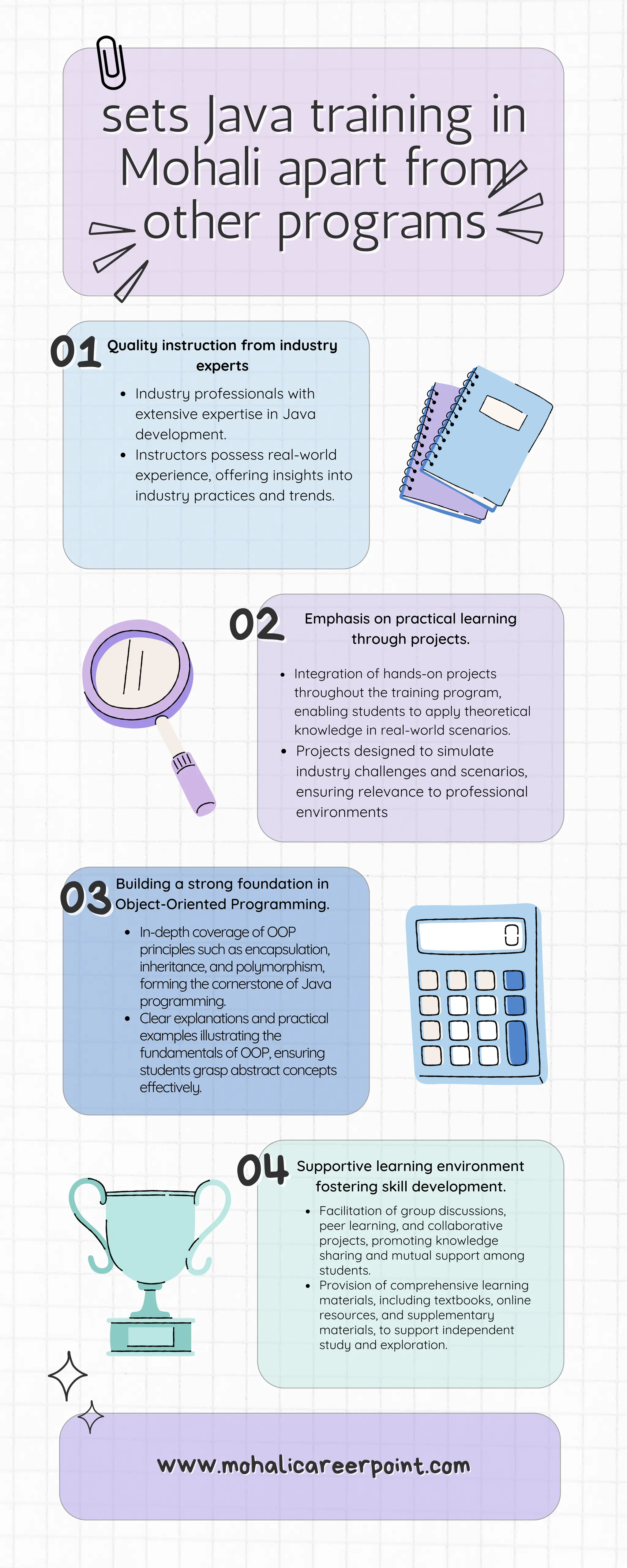 The Java training program in Mohali offers quality instruction from industry experts, emphasizing practical learning through hands-on projects that simulate real-world scenarios. It focuses on building a strong foundation in object-oriented programming principles, such as encapsulation, inheritance, and polymorphism. Additionally, the program fosters a supportive learning environment with group discussions and provides extensive learning materials to enhance student understanding and engagement.