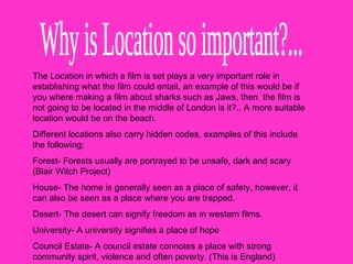 The document discusses possible locations for filming a horror movie. It analyzes how different locations carry symbolic meanings that can enhance a film's genre and storyline. Specifically, it considers Cowes High School, Quarr Abbey, and a church as potential sites for the film "Blood Circle" due to their eerie, isolated atmospheres. However, the abbey is ruled out for being a sacred site. In the end, a house is chosen as the filming location to make the horror more relatable and personal for audiences.