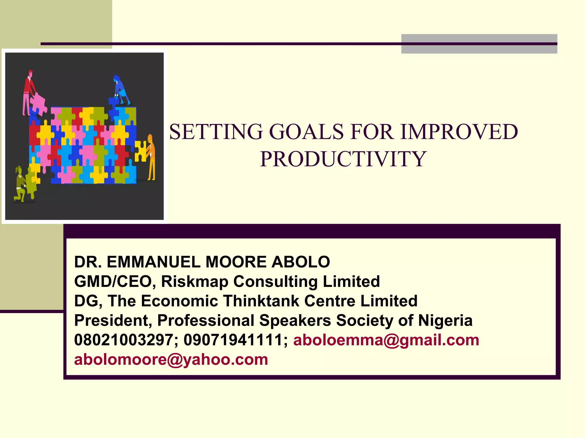 The document outlines the process and importance of goal setting in enhancing employee productivity, highlighting key principles such as creating SMART goals and involving employees in the goal-setting process. It emphasizes that clearly defined, motivating goals provide direction, increase motivation, and can lead to greater fulfillment in the workplace. Additionally, it stresses the need for regular review and adaptation of goals to maintain engagement and align them with broader business objectives.
