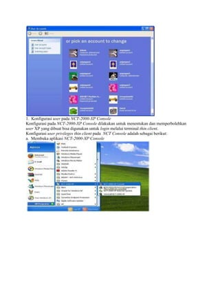 Dokumen ini menjelaskan langkah-langkah konfigurasi dan instalasi sistem thin client NComputing, termasuk pembuatan user di server dan pengaturan hak akses. Konfigurasi juga mencakup pengaturan alamat IP untuk terminal thin client serta pengaturan profil koneksi dan auto login. Selain itu, terdapat penjelasan tentang instalasi Deep Freeze untuk melindungi sistem server.