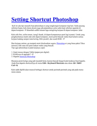 Tips untuk mempercepat penggunaan Photoshop adalah dengan menggunakan tablet grafis alih-alih mouse dan mengubah shortcut default Photoshop sesuai kebutuhan pengguna. Shortcut dapat diubah dengan masuk ke menu Edit > Keyboard Shortcuts lalu menambah atau menghapus shortcut secara manual. Pengguna juga dapat mengembalikan shortcut ke pengaturan default.