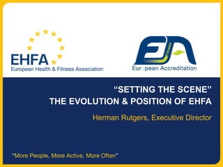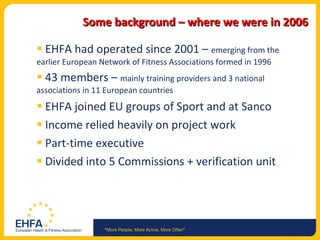 EHFA has evolved from a small organization in 2001 to a larger organization with 18 member associations from 24 countries by 2010. EHFA developed fitness industry standards and an accreditation system for training providers called EREPS. EHFA secured EU funding for several projects related to standards, vocational education and training, and promoting physical activity. By 2010, EHFA had expanded its operations and staff based in Brussels to represent the fitness industry on EU policy issues like health, employment, and education.