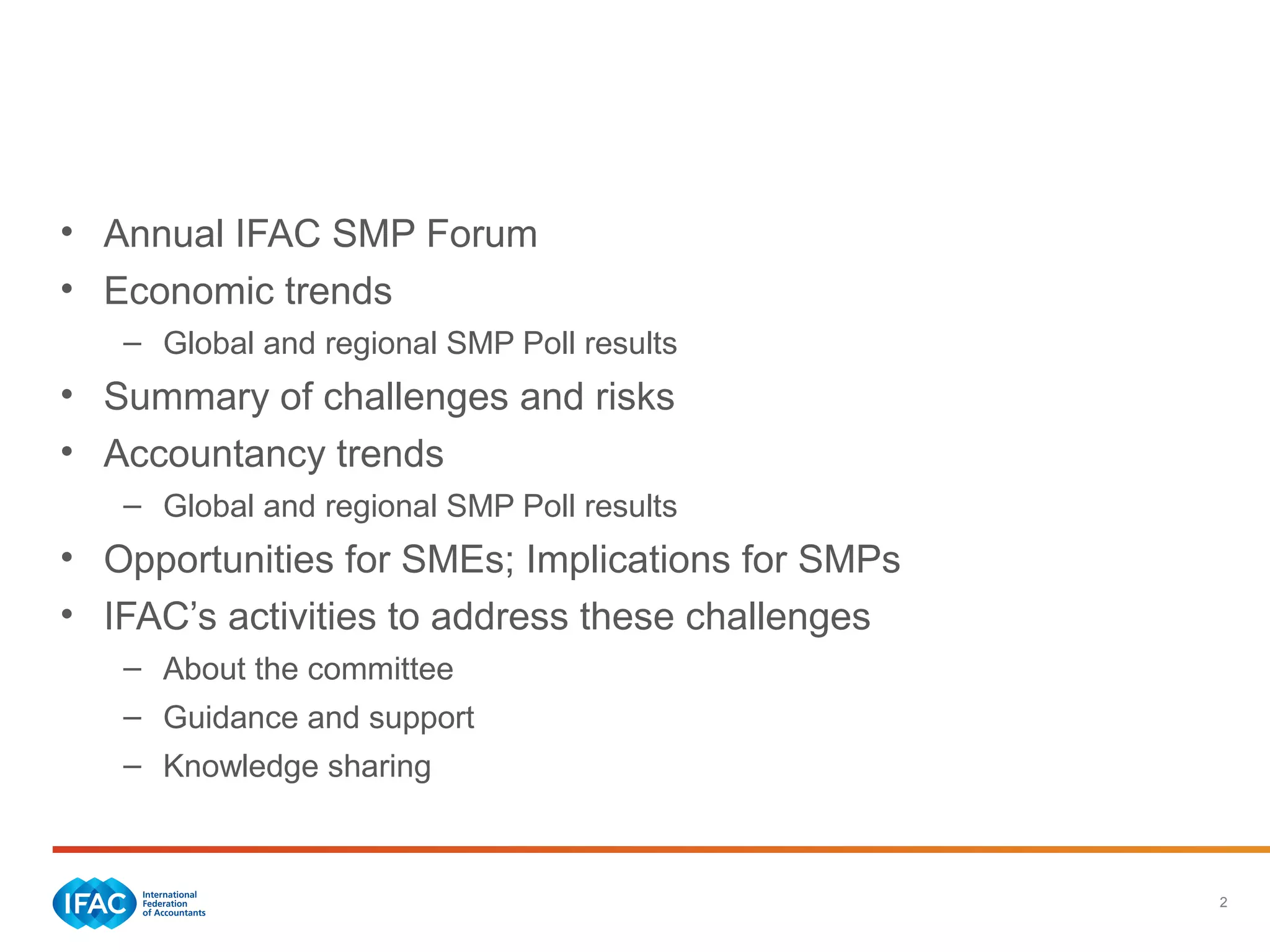 This document summarizes the key topics discussed at the 2013 IFAC SMP Forum in Kampala, Uganda. It outlines global and regional economic trends, challenges facing SMPs, opportunities for SMEs, and IFAC's activities to support SMPs. Economic uncertainty remains for many regions, though growth continues in Africa. SMPs are expanding services like advisory work. IFAC works to represent SMP interests through the SMP Committee and developing guidance to address issues around standards, skills, and competition.