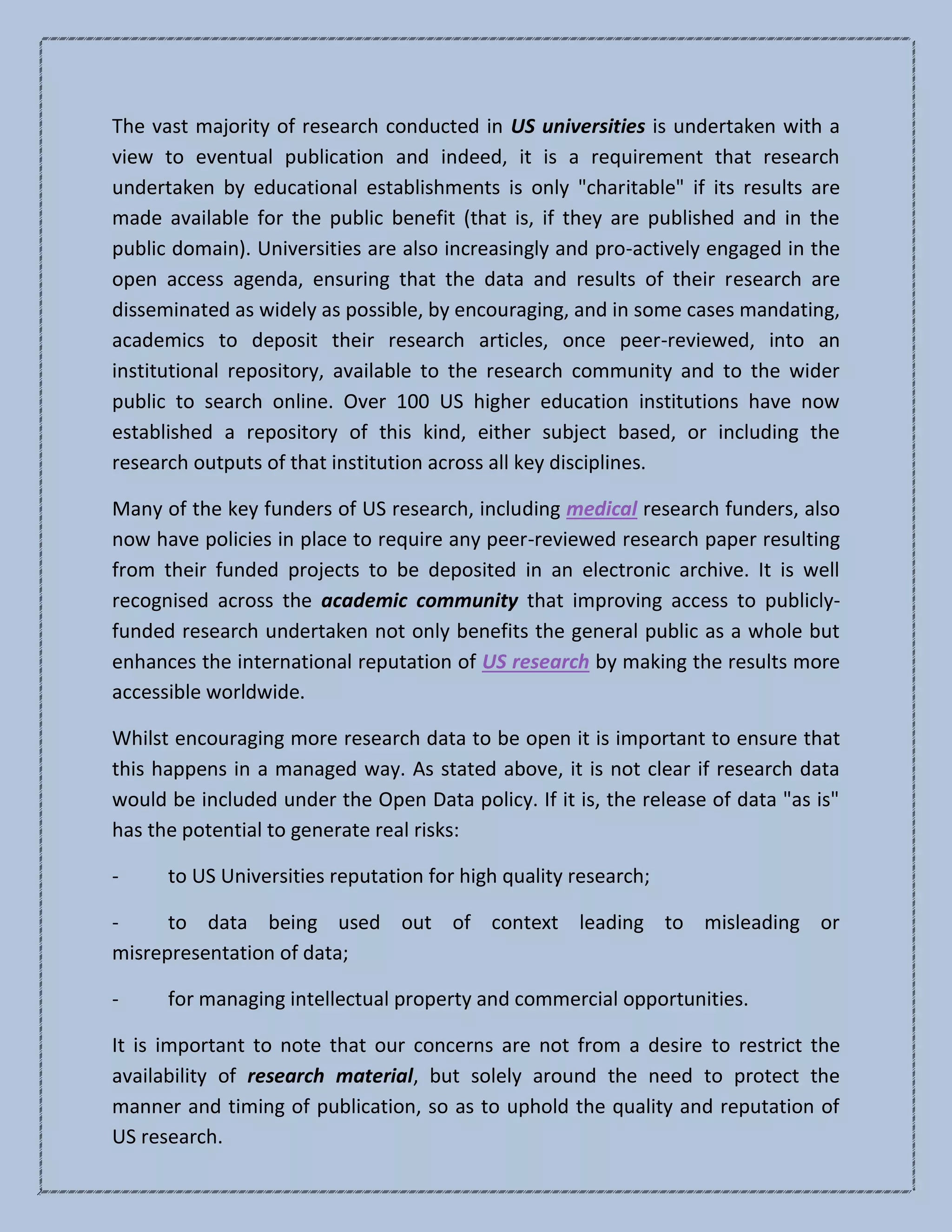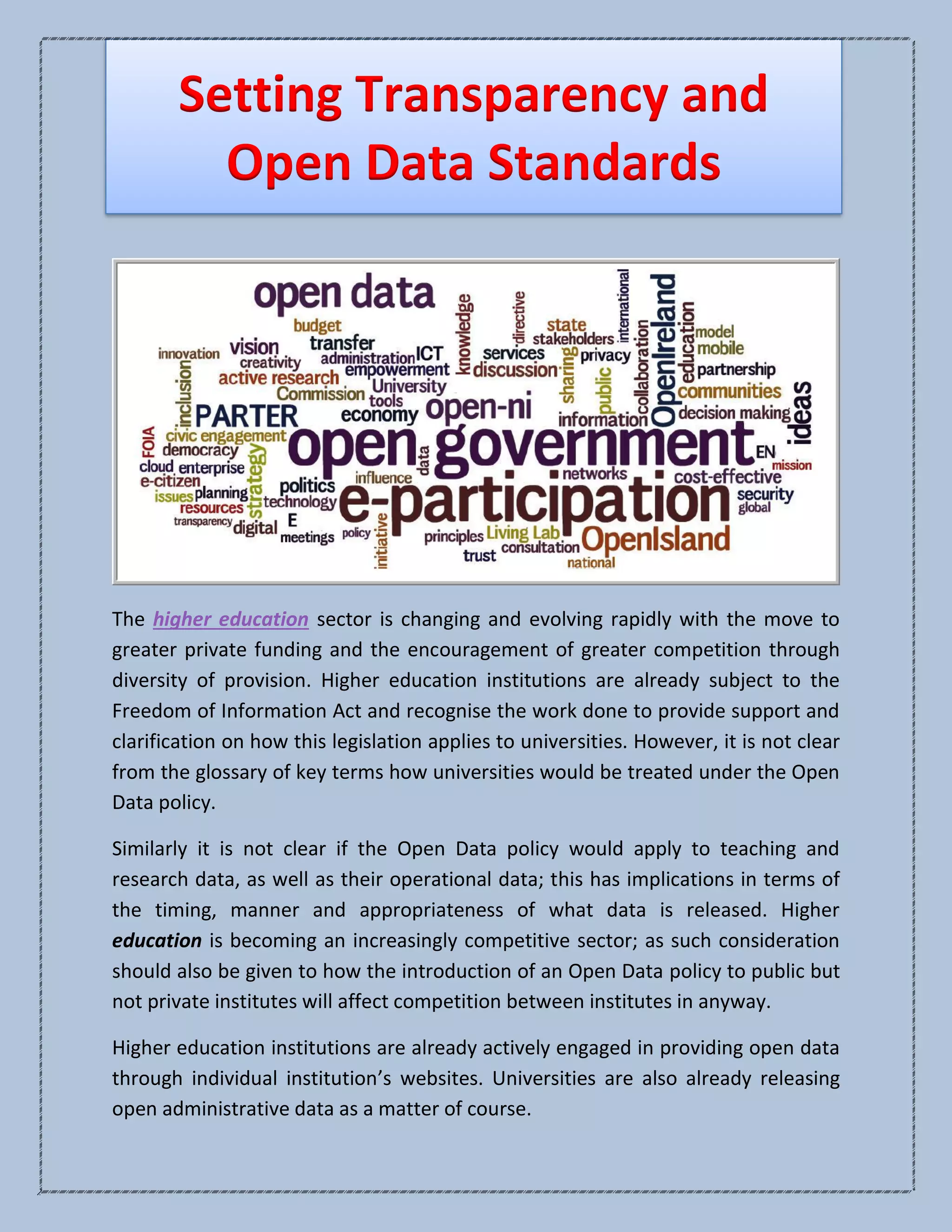 The document discusses the evolving role of transparency and open data standards in higher education, highlighting the implications of an open data policy for universities, including potential risks to research quality and intellectual property rights. It emphasizes the need for clear guidelines on what data can be released, while also proposing a model publication scheme for public institutions to ensure proactive access to information. Additionally, it outlines best practices for managing open data to promote efficiency and economic growth without compromising research integrity.