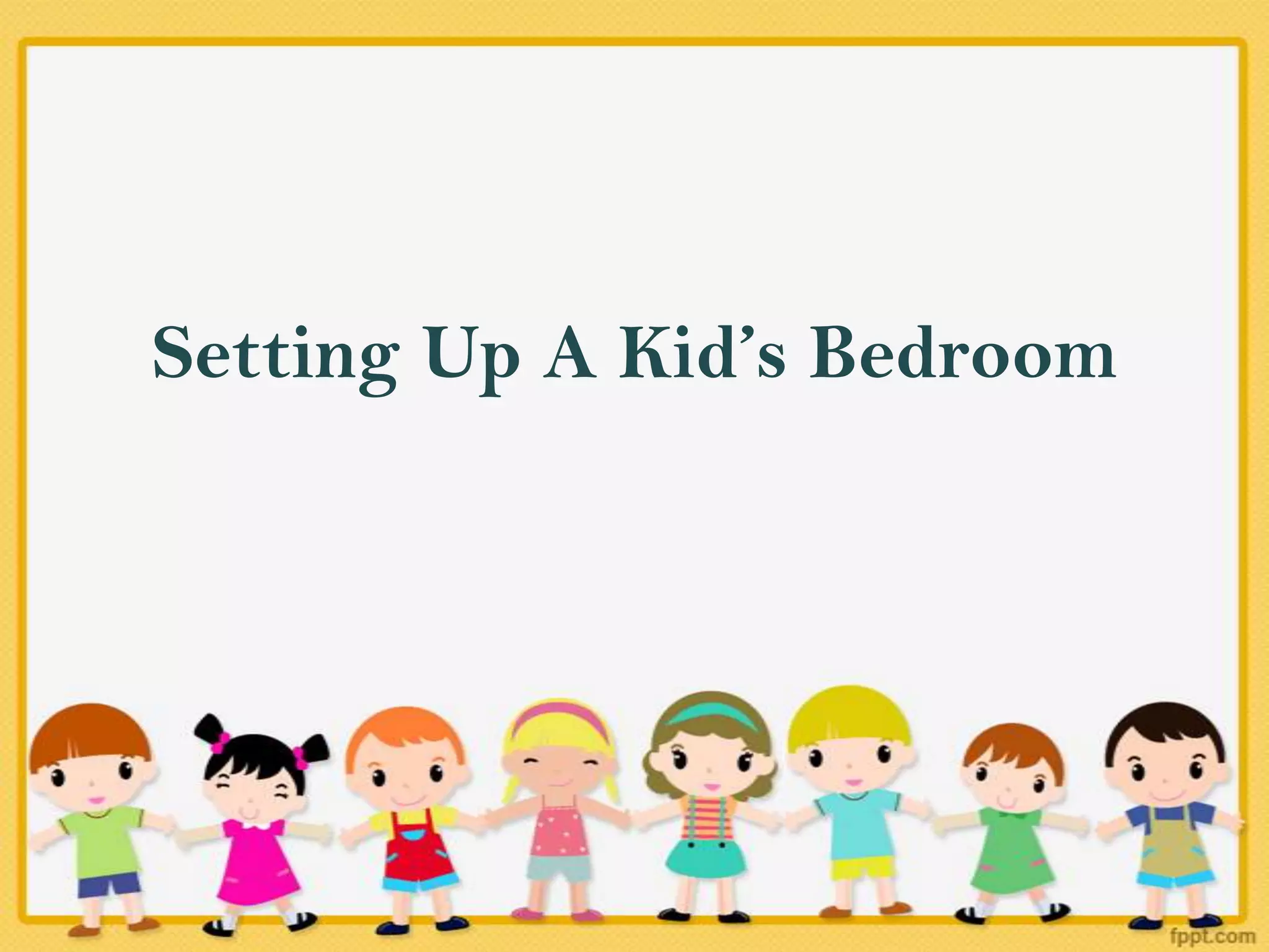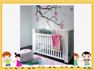 This document provides tips for setting up a kid's bedroom as they grow out of the nursery stage. It recommends that the bed be easy to access from both sides to make nighttime changes easier. Drawers and cubby storage are suggested for clothes and toys to keep items organized and accessible for the child. A comfy chair and lamp are also recommended for bedtime stories. Curtains are said to help set day and night routines.
