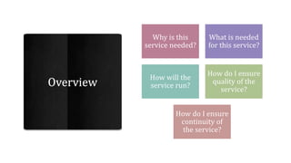 This document outlines the key considerations for planning and implementing a new healthcare service, including: