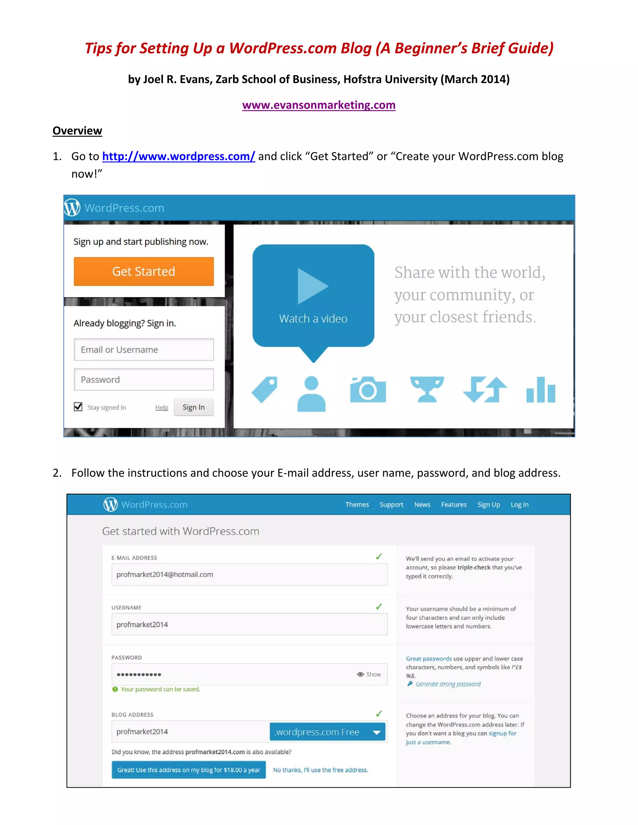 This document provides a beginner's guide for setting up a WordPress.com blog, detailing the steps from creating an account to customizing settings and adding posts. Key points include selecting a free option, verifying settings, uploading images, and categorizing posts. It also outlines tips for gaining followers and managing comments.